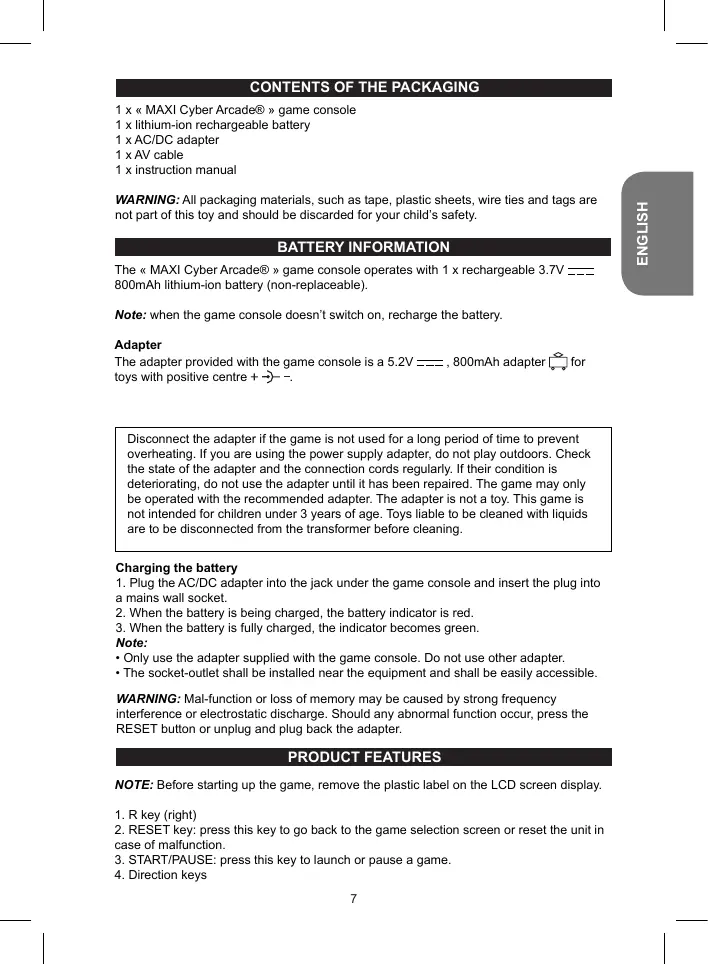 not part of this toy and should be discarded for your child’s safety. BATTERY INFORMATION The « MAXI Cyber Arcade® » game console operates with 1 x rechargeable 3.7V 800mAh lithium-ion battery (non-replaceable). Note: when the game console doesn’t switch on, recharge the battery. Adapter The adapter provided with the game console is a 5.2V toys with positive centre
