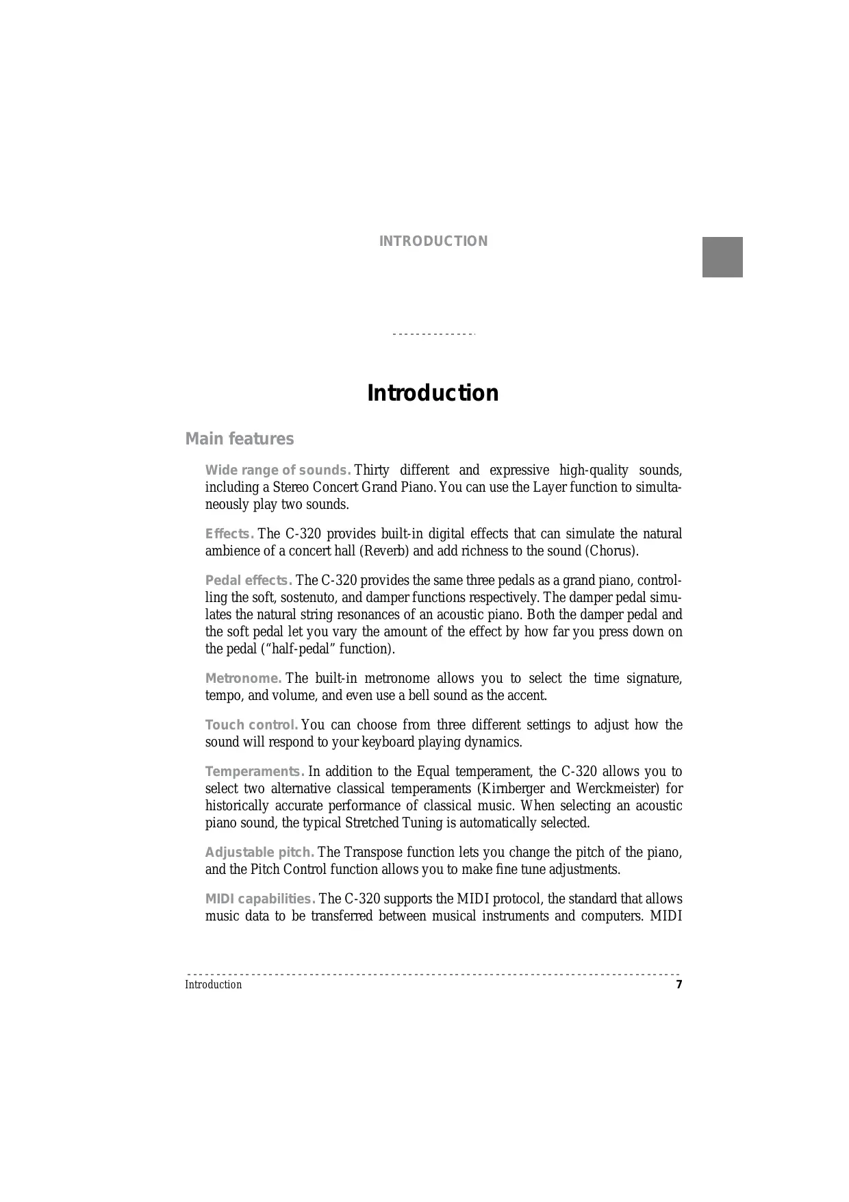 Le MIDI vous permet d’utiliser votre C-320 pour piloter d’autres instruments ou d’utiliser d’autres instruments pour piloter votre C-320, ainsi que d’utiliser un séquenceur pour composer des morceaux musicaux complexes. Lorsque vous jouez sur le clavier de votre C-320, ou vous appuyez sur la pédale, ou vous sélectionnez un timbre, les notes, l’activation de la pédale et le changement de timbres sont transmis à l’instrument connecté ou enregistré par le séquenceur.