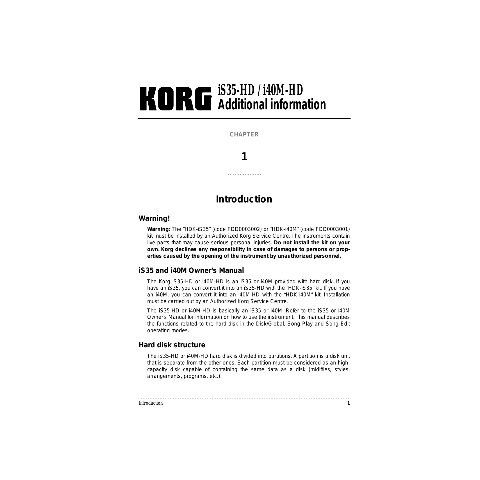 Mode d’emploi iS35 et i40M Korg iS35-HD et i40M-HD sont un iS35 ou un i40M dotés de disque dur. Si vous possédez un iS35, vous pouvez le transformer en iS35-HD en installant le kit “HDKiS35”. Si vous possédez un i40M, vous pouvez le transformer en i40M-HD en installant le kit “HDK-i40M”. L’installation doit être effectuée par un Centre d’Assistance