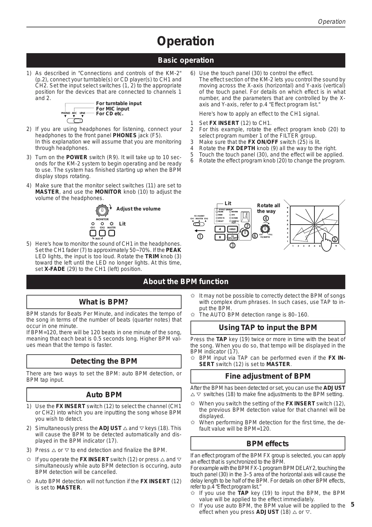 For example with the BPM FX-1 program BPM DELAY2, touching the touch panel (30) in the 3-5 area of the horizontal axis will cause the delay length to be half of the BPM. For details on other BPM effects, refer to p.4 "Effect program list."