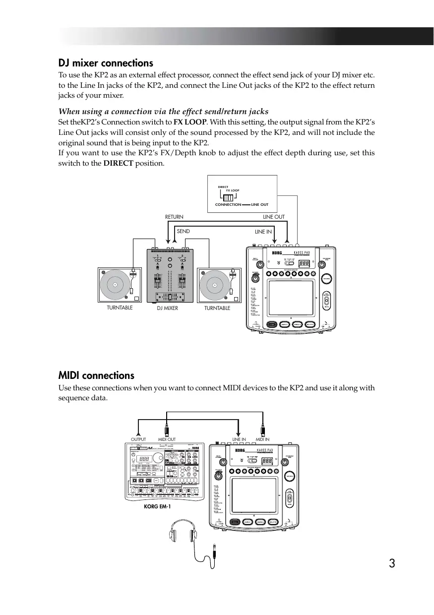 To use the KP2 as an external effect processor, connect the effect send jack of your DJ mixer etc. to the Line In jacks of the KP2, and connect the Line Out jacks of the KP2 to the effect return jacks of your mixer.