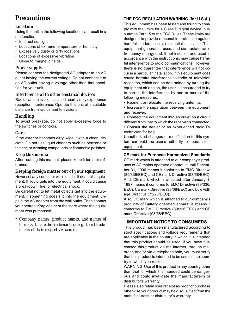 Be careful not to let metal objects get into the equipment. If something does slip into the equipment, unplug the AC adapter from the wall outlet. Then contact your nearest Korg dealer or the store where the equipment was purchased.