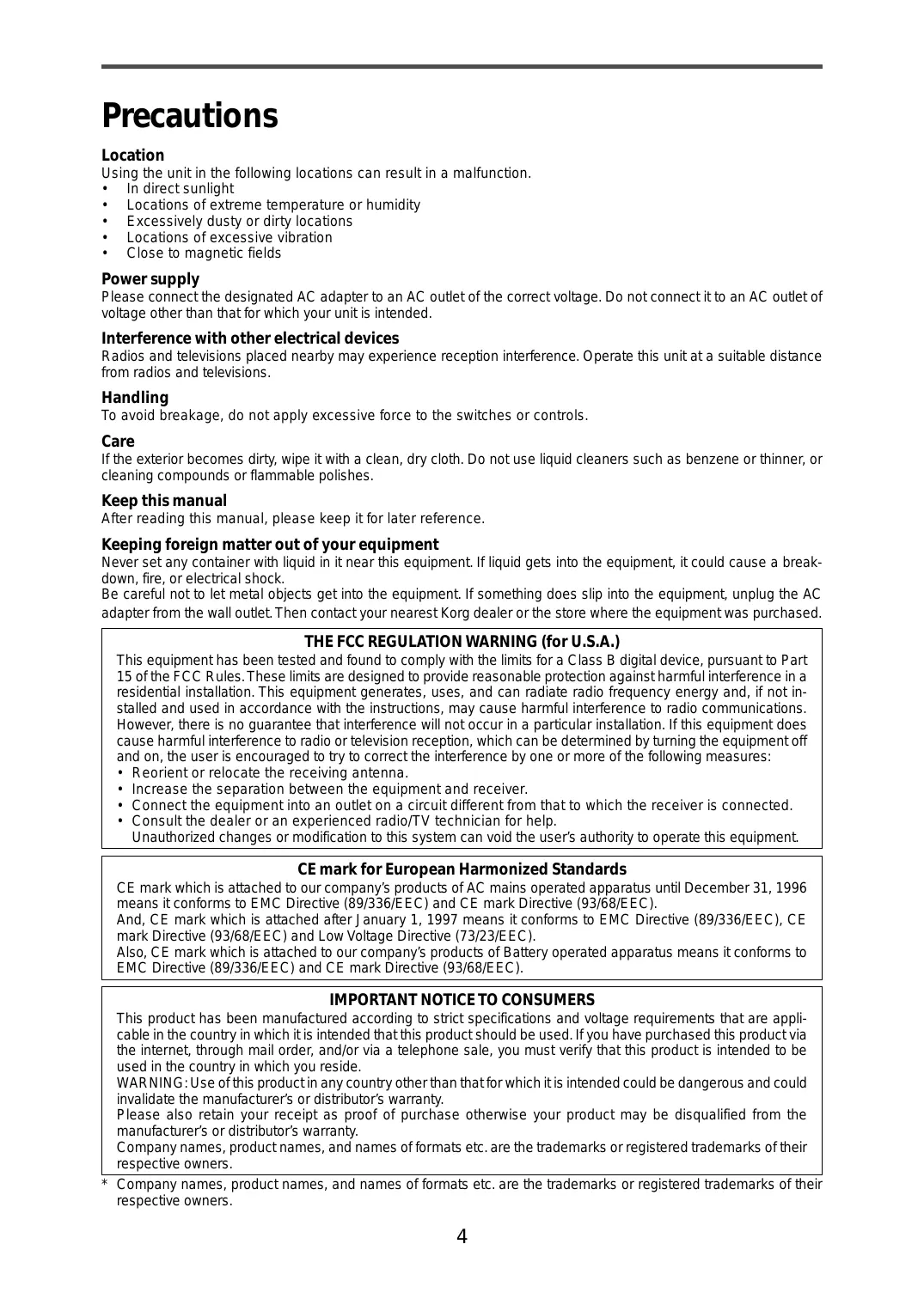 - Close to magnetic fields Power supply Please connect the designated AC adapter to an AC outlet of the correct voltage. Do not connect it to an AC outlet of voltage other than that for which your unit is intended. Interference with other electrical devices Radios and televisions placed nearby may experience reception interference. Operate this unit at a suitable distance from radios and televisions. Handling To avoid breakage, do not apply excessive force to the switches or controls. Care If the exterior becomes dirty, wipe it with a clean, dry cloth. Do not use liquid cleaners such as benzene or thinner, or cleaning compounds or flammable polishes. Keep this manual After reading this manual, please keep it for later reference. Keeping foreign matter out of your equipment Never set any container with liquid in it near this equipment. If liquid gets into the equipment, it could cause a breakdown, fire, or electrical shock. Be careful not to let metal objects get into the equipment. If something does slip into the equipment, unplug the AC adapter from the wall outlet. Then contact your nearest Korg dealer or the store where the equipment was purchased. THE FCC REGULATION WARNING (for U.S.A.) This equipment has been tested and found to comply with the limits for a Class B digital device, pursuant to Part 15 of the FCC Rules. These limits are designed to provide reasonable protection against harmful interference in a residential installation. This equipment generates, uses, and can radiate radio frequency energy and, if not installed and used in accordance with the instructions, may cause harmful interference to radio communications. However, there is no guarantee that interference will not occur in a particular installation. If this equipment does cause harmful interference to radio or television reception, which can be determined by turning the equipment off and on, the user is encouraged to try to correct the interference by one or more of the following measures: