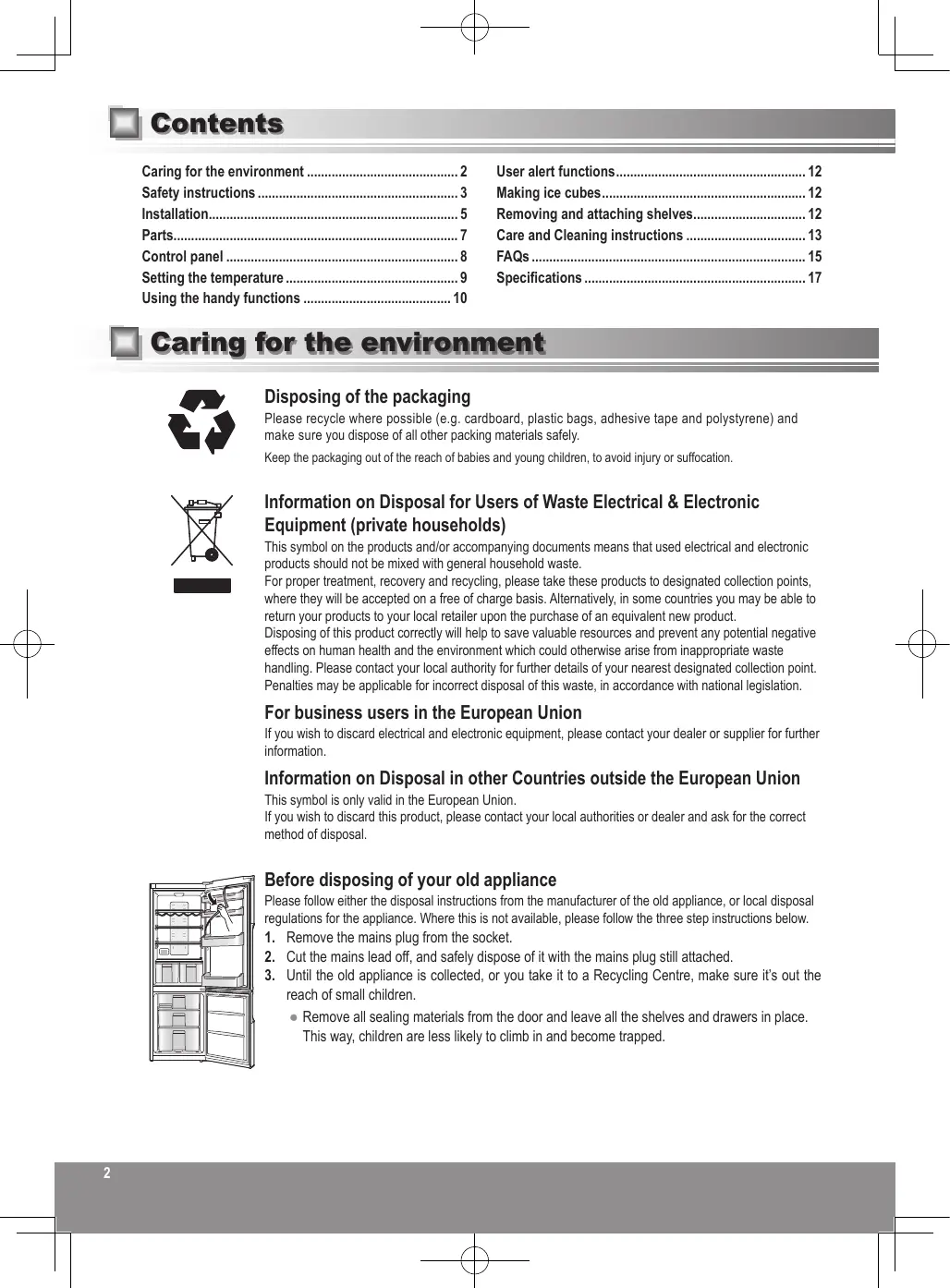 2. Cut the mains lead off, and safely dispose of it with the mains plug still attached. 3. Until the old appliance is collected, or you take it to a Recycling Centre, make sure it’s out the reach of small children. ● Remove all sealing materials from the door and leave all the shelves and drawers in place. This way, children are less likely to climb in and become trapped.