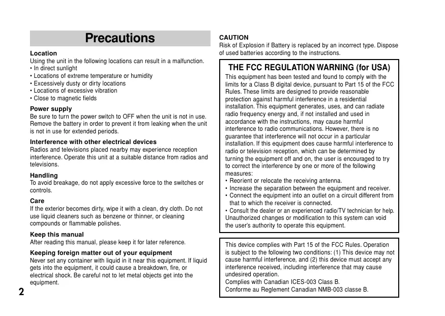 Precautions Location Using the unit in the following locations can result in a malfunction. • In direct sunlight • Locations of extreme temperature or humidity • Excessively dusty or dirty locations • Locations of excessive vibration • Close to magnetic fields Power supply Be sure to turn the power switch to OFF when the unit is not in use. Remove the battery in order to prevent it from leaking when the unit is not in use for extended periods. Interference with other electrical devices Radios and televisions placed nearby may experience reception interference. Operate this unit at a suitable distance from radios and televisions. Handling To avoid breakage, do not apply excessive force to the switches or controls. Care If the exterior becomes dirty, wipe it with a clean, dry cloth. Do not use liquid cleaners such as benzene or thinner, or cleaning compounds or flammable polishes. Keep this manual After reading this manual, please keep it for later reference. Keeping foreign matter out of your equipment Never set any container with liquid in it near this equipment. If liquid gets into the equipment, it could cause a breakdown, fire, or electrical shock. Be careful not to let metal objects get into the equipment.