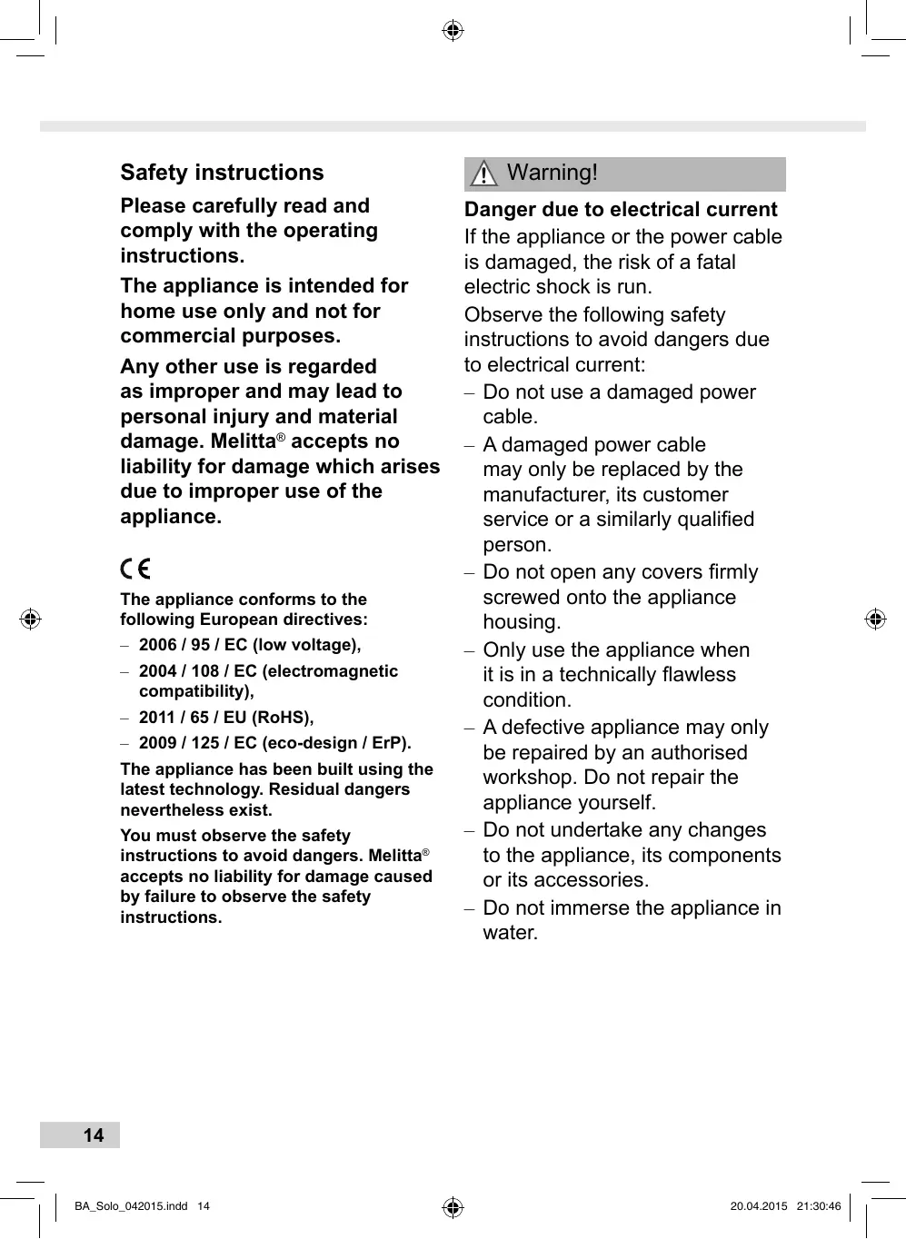 Safety instructions Please carefully read and comply with the operating instructions. The appliance is intended for home use only and not for commercial purposes. Any other use is regarded as improper and may lead to personal injury and material damage. Melitta® accepts no liability for damage which arises due to improper use of the appliance. The appliance conforms to the following European directives: – 2006 / 95 / EC (low voltage), – 2004 / 108 / EC (electromagnetic compatibility), – 2011 / 65 / EU (RoHS), – 2009 / 125 / EC (eco-design / ErP). The appliance has been built using the latest technology. Residual dangers nevertheless exist. You must observe the safety instructions to avoid dangers. Melitta® accepts no liability for damage caused by failure to observe the safety instructions. Warning! Danger due to electrical current If the appliance or the power cable is damaged, the risk of a fatal electric shock is run. Observe the following safety instructions to avoid dangers due to electrical current: – Do not use a damaged power cable. – A damaged power cable may only be replaced by the manufacturer, its customer service or a similarly qualified person. – Do not open any covers firmly screwed onto the appliance housing. – Only use the appliance when it is in a technically flawless condition. – A defective appliance may only be repaired by an authorised workshop. Do not repair the appliance yourself. – Do not undertake any changes to the appliance, its components or its accessories. – Do not immerse the appliance in water.
