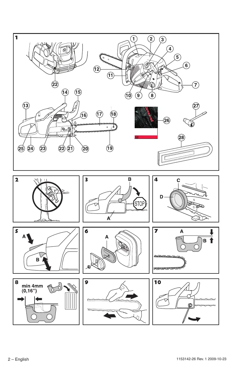 11 Chain oil tank 12 Product and serial number plate 13 Throttle lockout (Prevents accidental operation of throttle control.) 14 Front handle 15 Front hand guard 16 Muffler 17 Bar 18 Bar tip sprocket 19 Chain 20 Spike bumper 21 Chain catcher 22 Chain tensioning screw 23 Clutch cover 24 Rear handle with right hand guard 25 Throttle control 26 Operator′s manual 27 Combination spanner 28 Bar guard