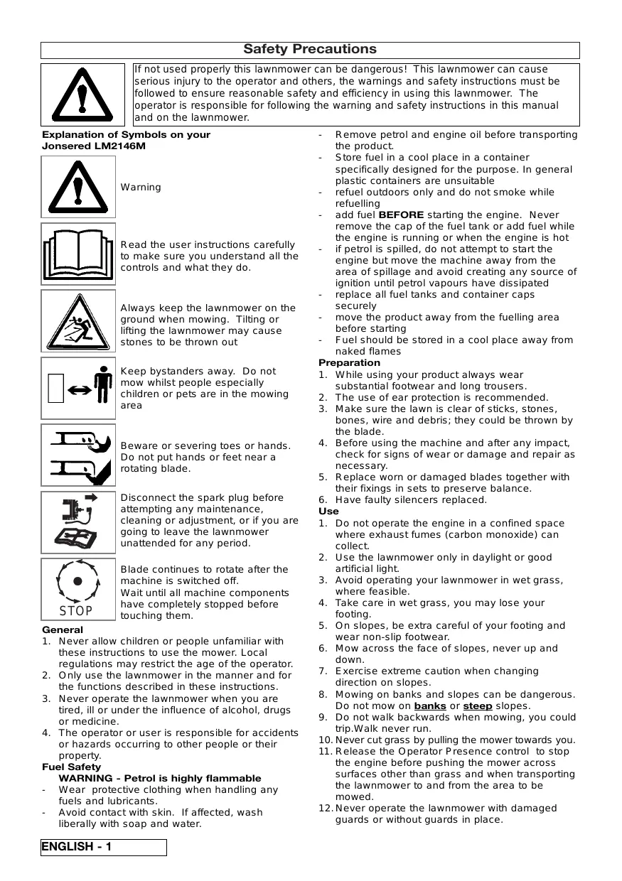 Remove petrol and engine oil before transporting the product. - Store fuel in a cool place in a container specifically designed for the purpose. In general plastic containers are unsuitable - refuel outdoors only and do not smoke while refuelling - add fuel BEFORE starting the engine. Never remove the cap of the fuel tank or add fuel while the engine is running or when the engine is hot - if petrol is spilled, do not attempt to start the engine but move the machine away from the area of spillage and avoid creating any source of ignition until petrol vapours have dissipated - replace all fuel tanks and container caps securely - move the product away from the fuelling area before starting - Fuel should be stored in a cool place away from naked flames Preparation 1. While using your product always wear substantial footwear and long trousers. 2. The use of ear protection is recommended. 3. Make sure the lawn is clear of sticks, stones, bones, wire and debris; they could be thrown by the blade. 4. Before using the machine and after any impact, check for signs of wear or damage and repair as necessary. 5. Replace worn or damaged blades together with their fixings in sets to preserve balance. 6. Have faulty silencers replaced. Use 1. Do not operate the engine in a confined space where exhaust fumes (carbon monoxide) can collect. 2. Use the lawnmower only in daylight or good artificial light. 3. Avoid operating your lawnmower in wet grass, where feasible. 4. Take care in wet grass, you may lose your footing. 5. On slopes, be extra careful of your footing and wear non-slip footwear. 6. Mow across the face of slopes, never up and down. 7. Exercise extreme caution when changing direction on slopes. 8. Mowing on banks and slopes can be dangerous. Do not mow on banks or steep slopes. 9. Do not walk backwards when mowing, you could trip.Walk never run. 10. Never cut grass by pulling the mower towards you. 11. Release the Operator Presence control to stop the engine before pushing the mower across surfaces other than grass and when transporting the lawnmower to and from the area to be mowed. 12. Never operate the lawnmower with damaged guards or without guards in place.