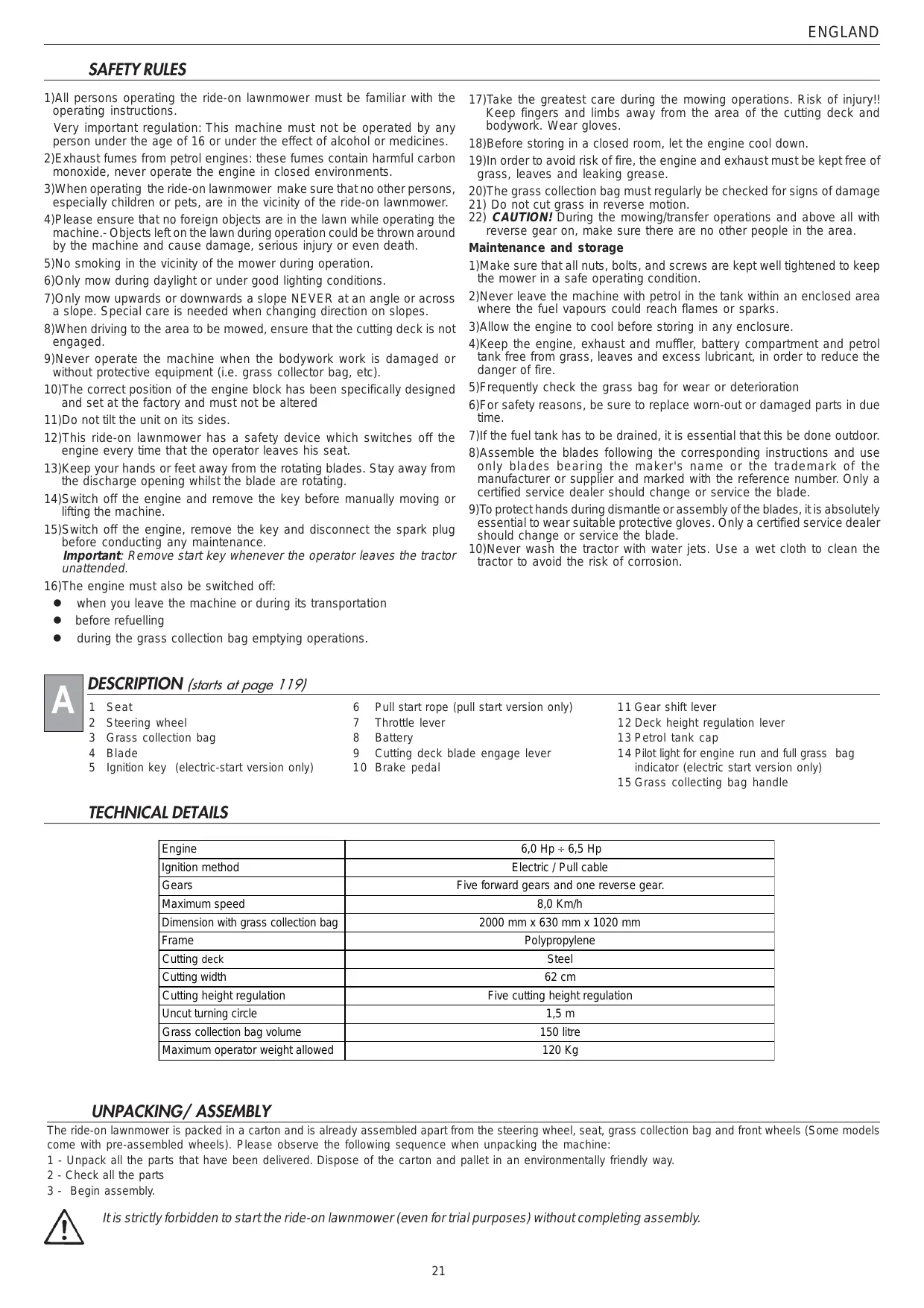 Keep fingers and limbs away from the area of the cutting deck and bodywork. Wear gloves. 18)Before storing in a closed room, let the engine cool down. 19)In order to avoid risk of fire, the engine and exhaust must be kept free of grass, leaves and leaking grease. 20)The grass collection bag must regularly be checked for signs of damage 21) Do not cut grass in reverse motion. 22) CAUTION! During the mowing/transfer operations and above all with reverse gear on, make sure there are no other people in the area. Maintenance and storage 1)Make sure that all nuts, bolts, and screws are kept well tightened to keep the mower in a safe operating condition. 2)Never leave the machine with petrol in the tank within an enclosed area where the fuel vapours could reach flames or sparks. 3)Allow the engine to cool before storing in any enclosure. 4)Keep the engine, exhaust and muffler, battery compartment and petrol tank free from grass, leaves and excess lubricant, in order to reduce the danger of fire. 5)Frequently check the grass bag for wear or deterioration 6)For safety reasons, be sure to replace worn-out or damaged parts in due time. 7)If the fuel tank has to be drained, it is essential that this be done outdoor. 8)Assemble the blades following the corresponding instructions and use only blades bearing the maker's name or the trademark of the manufacturer or supplier and marked with the reference number. Only a certified service dealer should change or service the blade. 9)To protect hands during dismantle or assembly of the blades, it is absolutely essential to wear suitable protective gloves. Only a certified service dealer should change or service the blade. 10)Never wash the tractor with water jets. Use a wet cloth to clean the tractor to avoid the risk of corrosion.