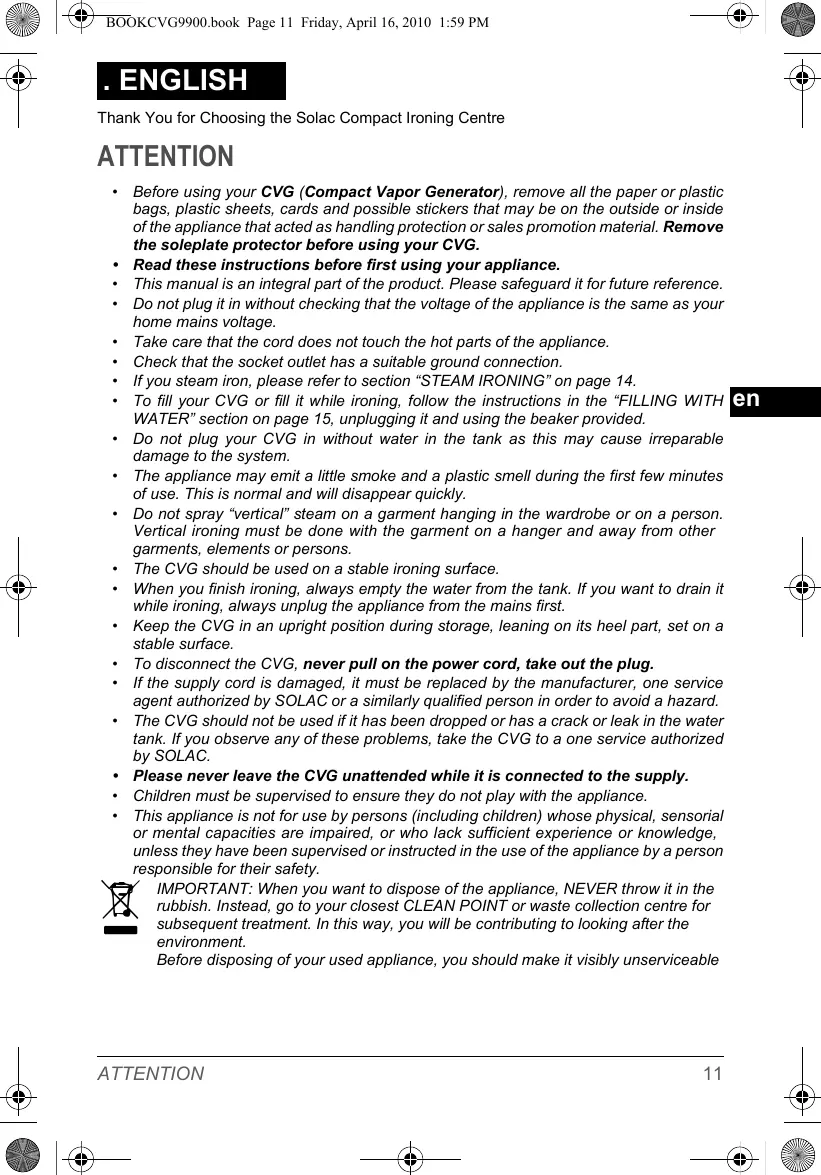 - This appliance is not for use by persons (including children) whose physical, sensorial or mental capacities are impaired, or who lack sufficient experience or knowledge, unless they have been supervised or instructed in the use of the appliance by a person responsible for their safety. IMPORTANT: When you want to dispose of the appliance, NEVER throw it in the rubbish. Instead, go to your closest CLEAN POINT or waste collection centre for subsequent treatment. In this way, you will be contributing to looking after the environment. Before disposing of your used appliance, you should make it visibly unserviceable
