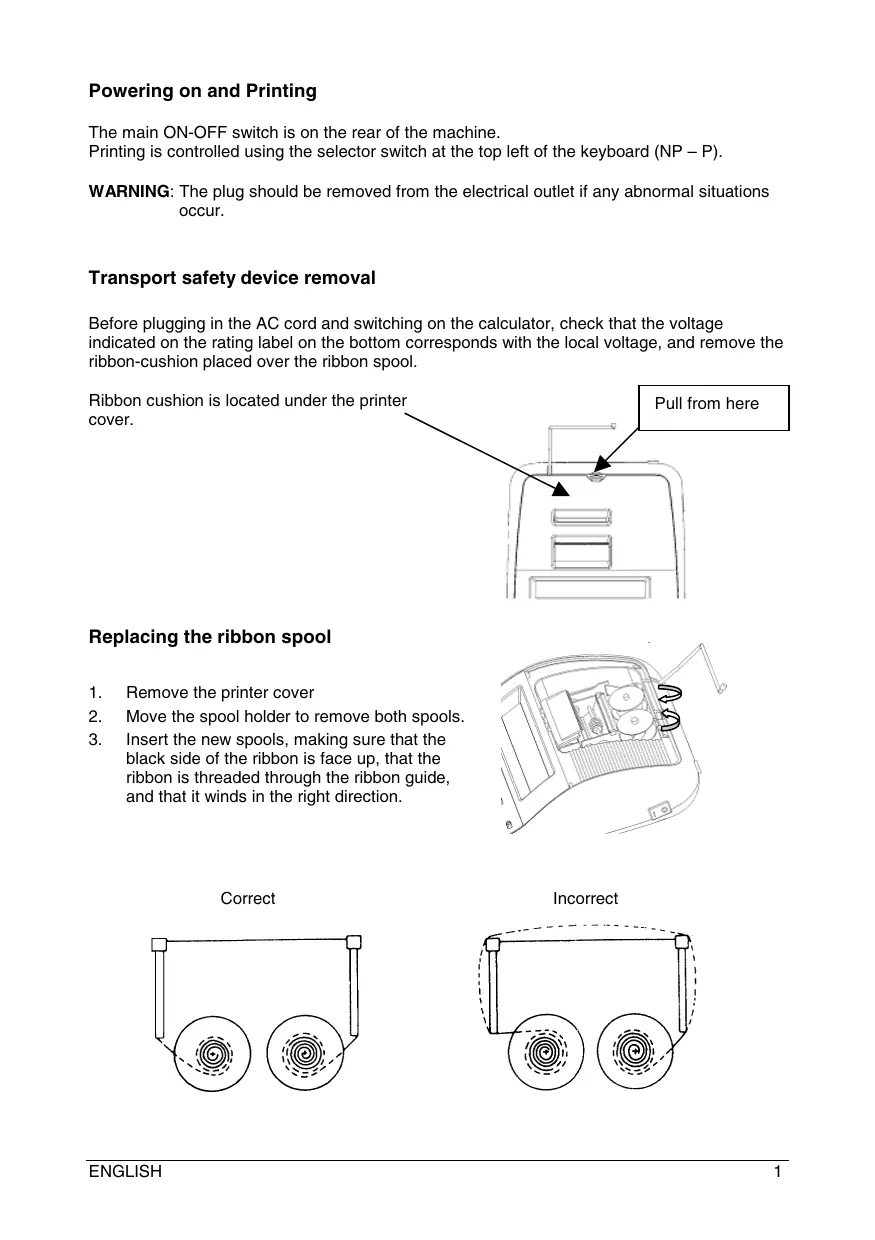 occur. Transport safety device removal Before plugging in the AC cord and switching on the calculator, check that the voltage indicated on the rating label on the bottom corresponds with the local voltage, and remove the ribbon-cushion placed over the ribbon spool. Ribbon cushion is located under the printer cover. Pull from here Replacing the ribbon spool