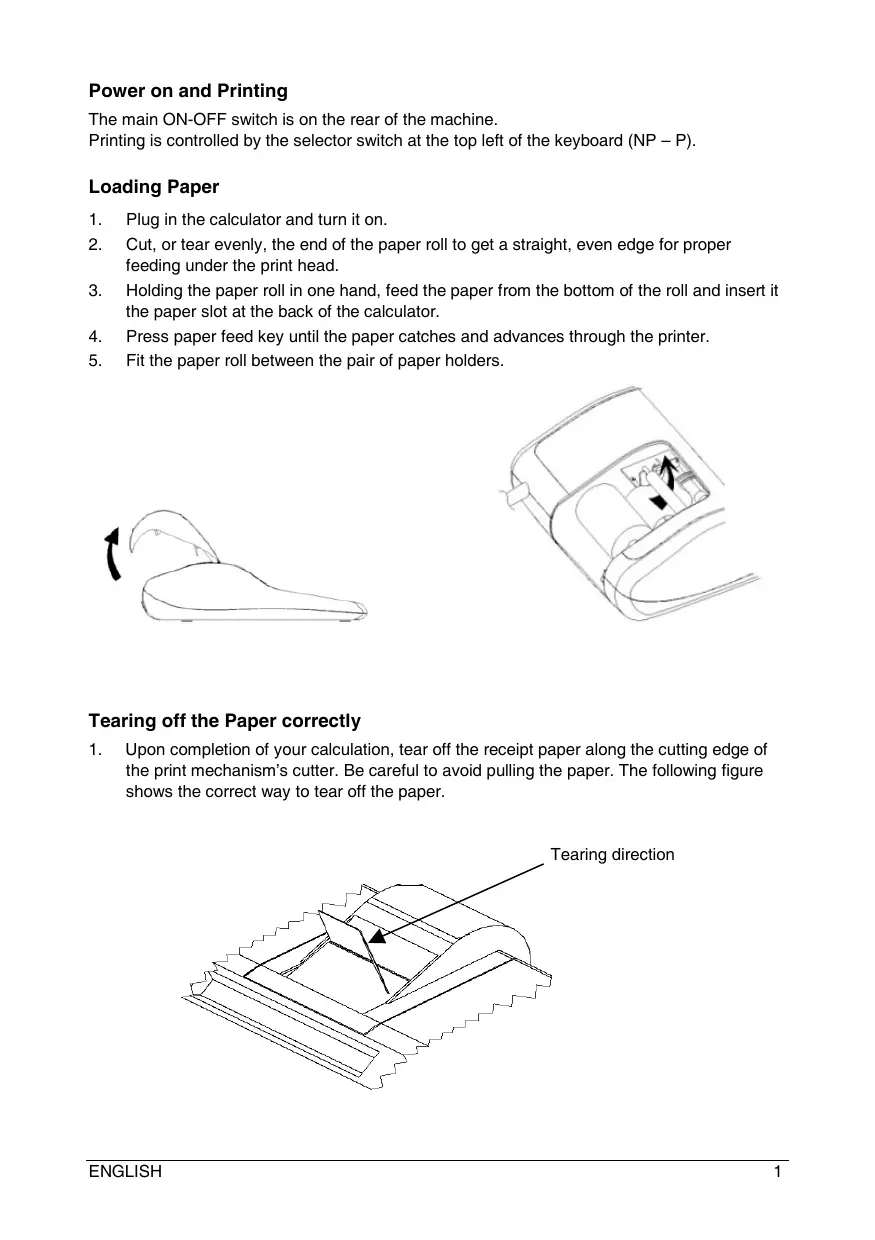 Minus (Negative) Overflow or Error Used in Auto Call function only. Power on and Printing The main ON-OFF switch is on the rear of the machine. Printing is controlled by the selector switch at the top left of the keyboard (NP – P). Plug in the calculator and turn it on. Cut, or tear evenly, the end of the paper roll to get a straight, even edge for proper feeding under the print head. Holding the paper roll in one hand, feed the paper from the bottom of the roll and insert it the paper slot at the back of the calculator. Press paper feed key until the paper catches and advances through the printer. Fit the paper roll between the pair of paper holders. Tearing off the Paper correctly