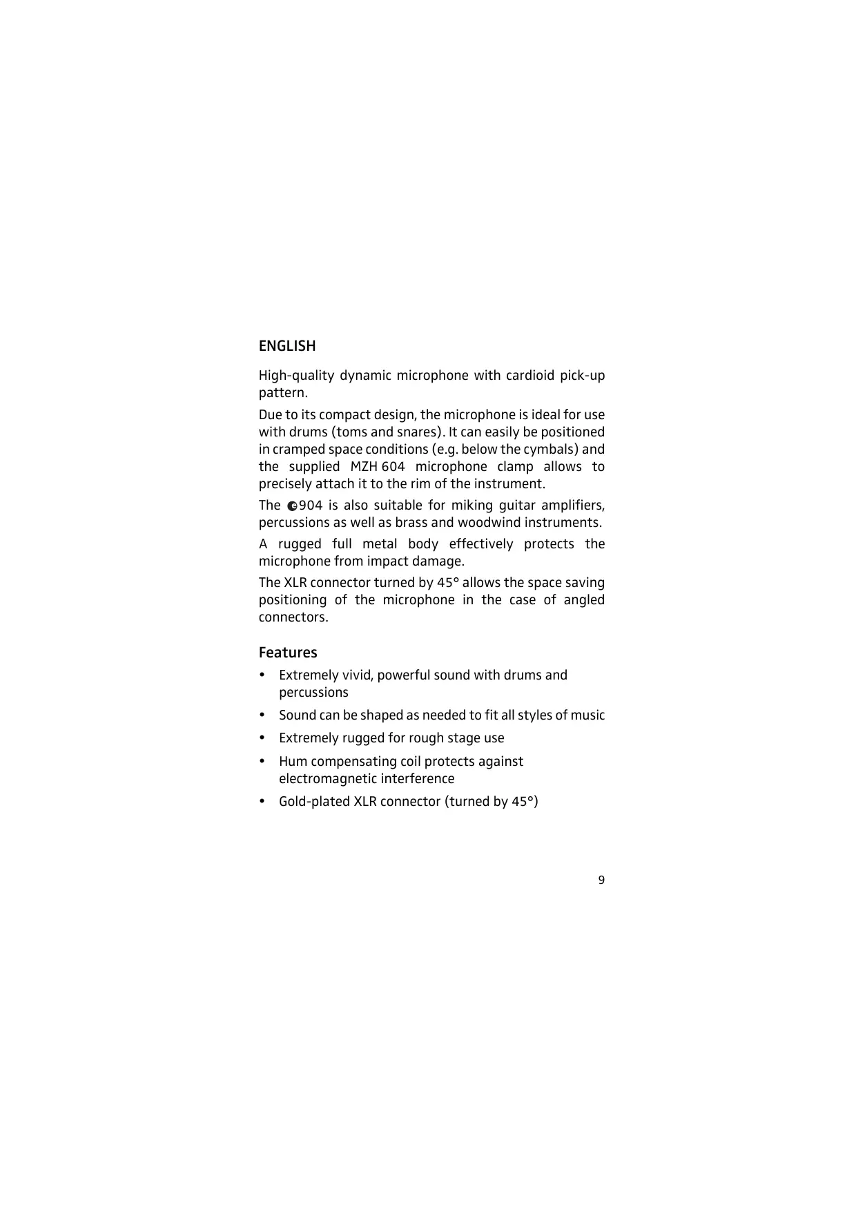 ENGLISH High-quality dynamic microphone with cardioid pick-up pattern. Due to its compact design, the microphone is ideal for use with drums (toms and snares). It can easily be positioned in cramped space conditions (e.g. below the cymbals) and the supplied MZH 604 microphone clamp allows to precisely attach it to the rim of the instrument. The 904 is also suitable for miking guitar amplifiers, percussions as well as brass and woodwind instruments. A rugged full metal body effectively protects the microphone from impact damage. The XLR connector turned by 45° allows the space saving positioning of the microphone in the case of angled connectors. Features y Extremely vivid, powerful sound with drums and percussions y Sound can be shaped as needed to fit all styles of music y Extremely rugged for rough stage use y Hum compensating coil protects against electromagnetic interference y Gold-plated XLR connector (turned by 45°)