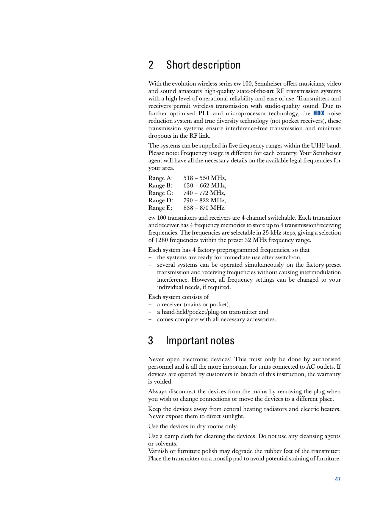 The systems can be supplied in five frequency ranges within the UHF band. Please note: Frequency usage is different for each country. Your Sennheiser agent will have all the necessary details on the available legal frequencies for your area.