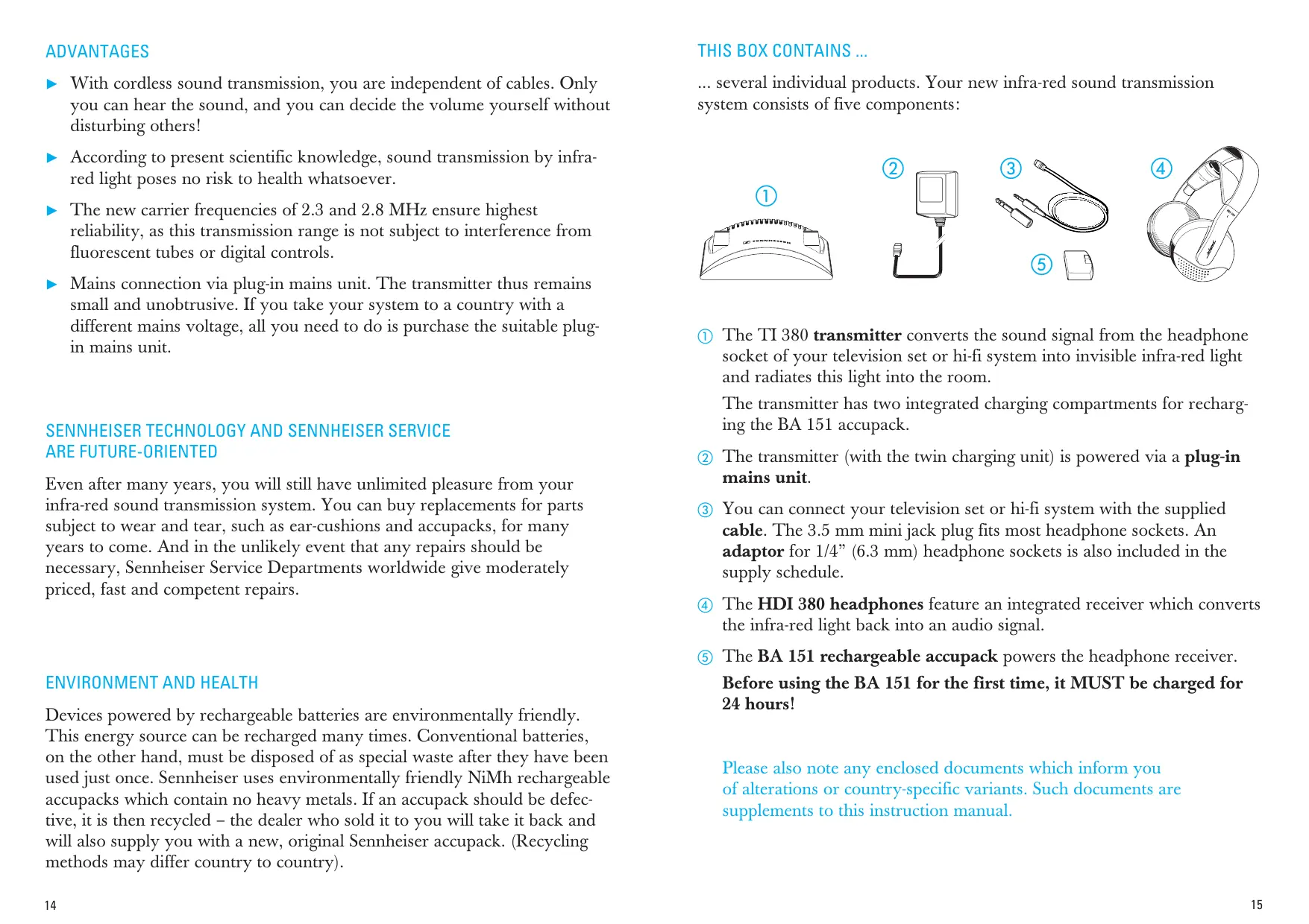 Even after many years, you will still have unlimited pleasure from your infra-red sound transmission system. You can buy replacements for parts subject to wear and tear, such as ear-cushions and accupacks, for many years to come. And in the unlikely event that any repairs should be necessary, Sennheiser Service Departments worldwide give moderately priced, fast and competent repairs.