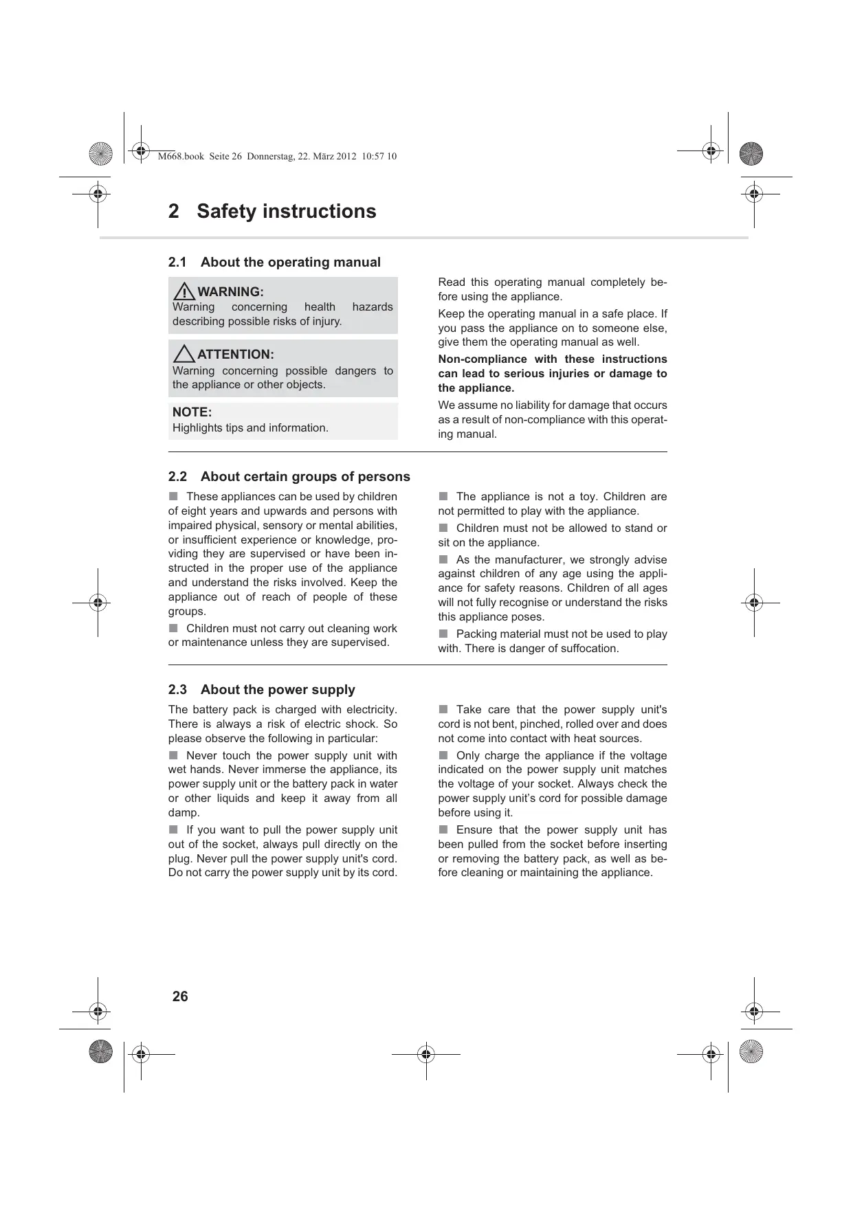 M668.book Seite 27 Donnerstag, 22. März 2012 10:57 10 2 Safety instructions About the battery pack supplied Wrong handling of the batteries can cause injury and explosion. ! Only use the power supply unit supplied with the appliance to charge the battery pack. Never charge the battery pack with another power supply unit. Use the power supply unit supplied solely to charge the battery pack of this appliance. ! Before removing the battery pack, ensure that the power supply unit has been removed from the socket. ! Never take the battery pack apart and never expose it to high temperatures. If not handled correctly, liquid could escape from the battery pack. Avoid any contact with the fluid.