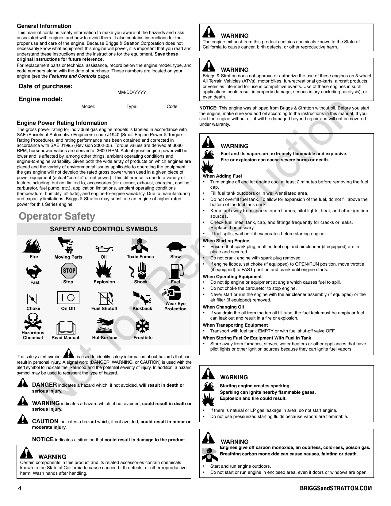 Engine model: WARNING Briggs & Stratton does not approve or authorize the use of these engines on 3-wheel All Terrain Vehicles (ATVs), motor bikes, fun/recreational go-karts, aircraft products, or vehicles intended for use in competitive events. Use of these engines in such applications could result in property damage, serious injury (including paralysis), or even death. Frostbite When Operating Equipment