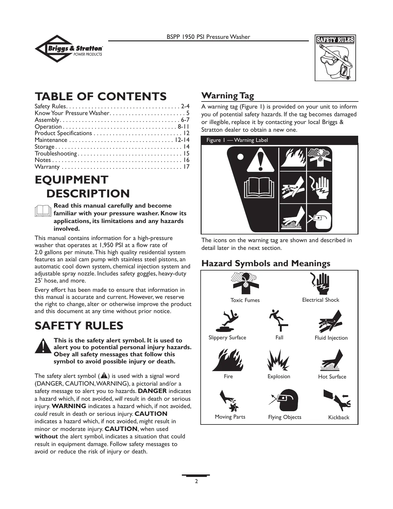 Warning Tag A warning tag (Figure 1) is provided on your unit to inform you of potential safety hazards. If the tag becomes damaged or illegible, replace it by contacting your local Briggs & Stratton dealer to obtain a new one. Figure 1 — Warning Label EQUIPMENT DESCRIPTION Read this manual carefully and become familiar with your pressure washer. Know its applications, its limitations and any hazards involved. This manual contains information for a high-pressure washer that operates at 1,950 PSI at a flow rate of