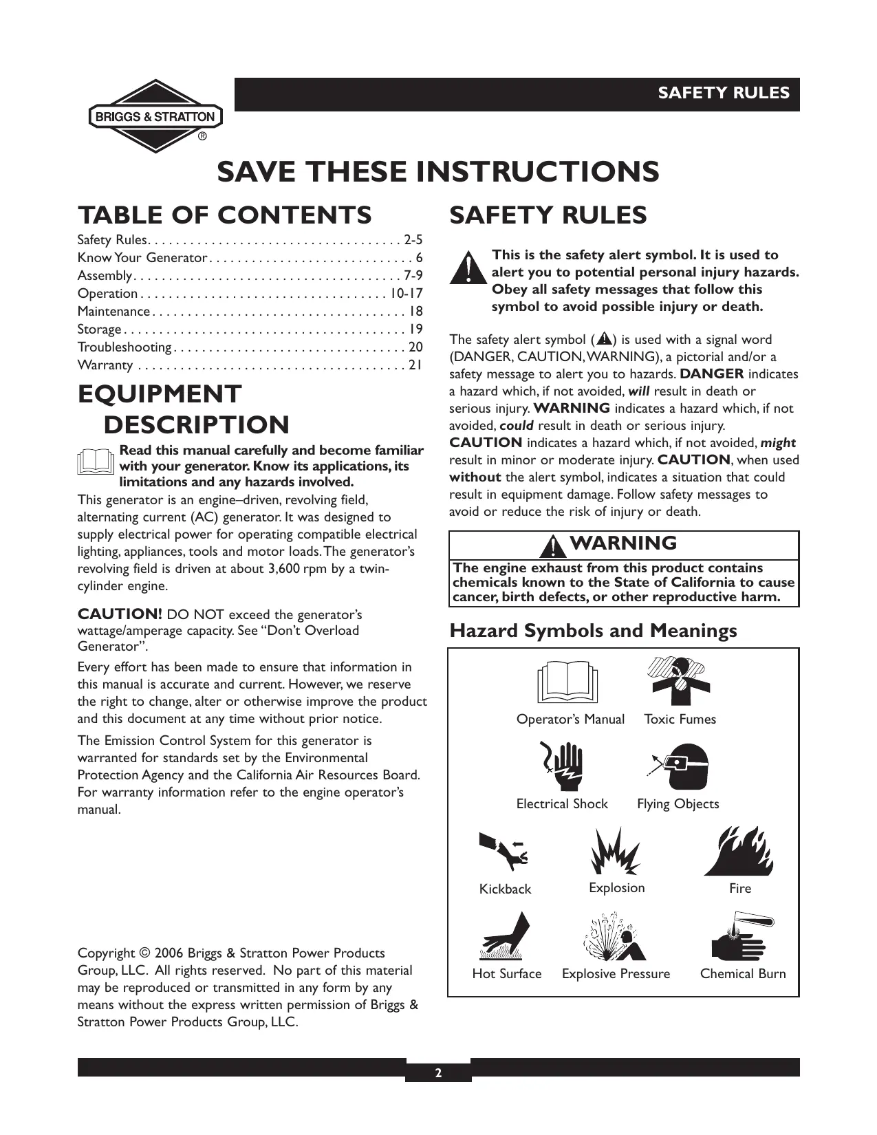 SAFETY RULES This is the safety alert symbol. It is used to alert you to potential personal injury hazards. Obey all safety messages that follow this symbol to avoid possible injury or death. The safety alert symbol ( ) is used with a signal word (DANGER, CAUTION,WARNING), a pictorial and/or a safety message to alert you to hazards. DANGER indicates a hazard which, if not avoided, will result in death or serious injury. WARNING indicates a hazard which, if not avoided, could result in death or serious injury. CAUTION indicates a hazard which, if not avoided, might result in minor or moderate injury. CAUTION, when used without the alert symbol, indicates a situation that could result in equipment damage. Follow safety messages to avoid or reduce the risk of injury or death. EQUIPMENT DESCRIPTION Read this manual carefully and become familiar with your generator. Know its applications, its limitations and any hazards involved. This generator is an engine–driven, revolving field, alternating current (AC) generator. It was designed to supply electrical power for operating compatible electrical lighting, appliances, tools and motor loads.The generator’s revolving field is driven at about 3,600 rpm by a twincylinder engine. WARNING The engine exhaust from this product contains chemicals known to the State of California to cause cancer, birth defects, or other reproductive harm. CAUTION! DO NOT exceed the generator’s Hazard Symbols and Meanings wattage/amperage capacity. See “Don’t Overload Generator”. Every effort has been made to ensure that information in this manual is accurate and current. However, we reserve the right to change, alter or otherwise improve the product and this document at any time without prior notice. Operator’s Manual The Emission Control System for this generator is warranted for standards set by the Environmental Protection Agency and the California Air Resources Board. For warranty information refer to the engine operator’s manual. Electrical Shock Copyright © 2006 Briggs & Stratton Power Products Group, LLC. All rights reserved. No part of this material may be reproduced or transmitted in any form by any means without the express written permission of Briggs & Stratton Power Products Group, LLC.
