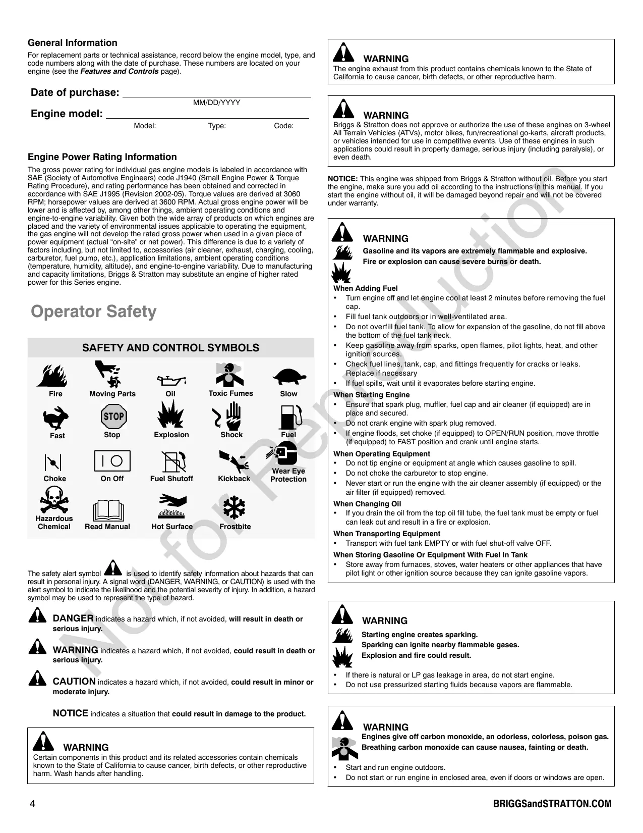 Engine model: Model Type: Code: Engine Power Rating Information The gross power rating for individual gas engine models is labeled in accordance with SAE (Society of Automotive Engineers) code J1940 (Small Engine Power & Torque Rating Procedure), and rating performance has been obtained and corrected in accordance with SAE J1995 (Revision 2002-05). Torque values are derived at 3060 RPM: horsepower values are derived at 3600 RPM. Actual gross engine power will be lower and is affected by, among other things, ambient operating conditions and engine-to-engine variability. Given both the wide array of products on which engines are placed and the variety of environmental issues applicable to operating the equipment, he gas engine will not develop the rated gross power when used in a given piece of power equipment (actual “on-site or net power). This difference is due to a variety of factors including, but not limited to, accessories (air cleaner, exhaust, charging, cooling, carburetor, fuel pump, etc), application limitations, ambient operating conditions (temperature, humidity, altitude), and engine-to-engine variabilty. Due to manufacturing and capacity limitations, Briggs & Stratton may substitute an engine of higher rated power for this Series engine. Operator Safety