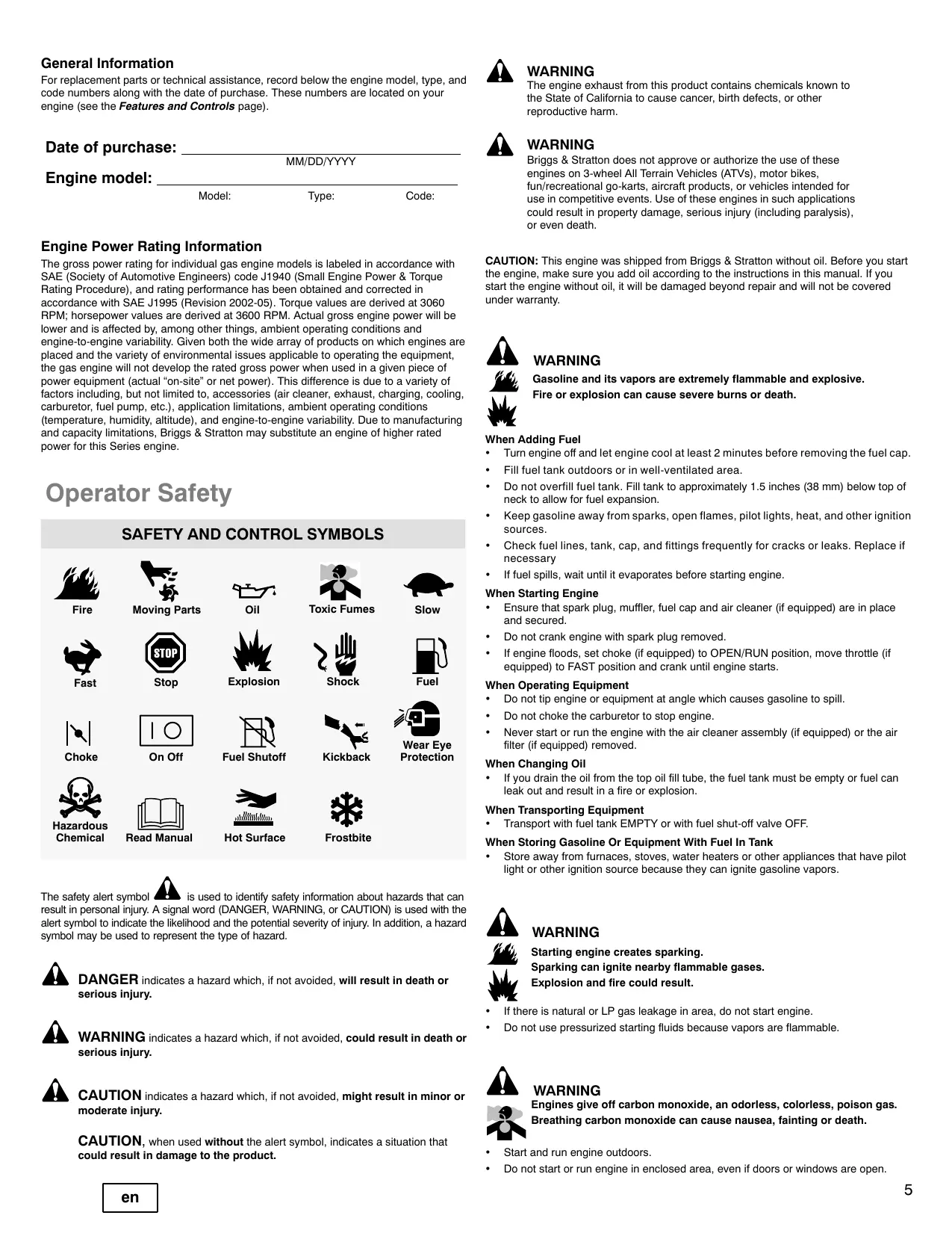 Engine model: Model: Type: Code: Engine Power Rating Information The gross power rating for individual gas engine models is labeled in accordance with SAE (Society of Automotive Engineers) code J1940 (Small Engine Power & Torque Rating Procedure), and rating performance has been obtained and corrected in accordance with SAE J1995 (Revision 2002-05). Torque values are derived at 3060 RPM; horsepower values are derived at 3600 RPM. Actual gross engine power will be lower and is affected by, among other things, ambient operating conditions and engine-to-engine variability. Given both the wide array of products on which engines are placed and the variety of environmental issues applicable to operating the equipment, the gas engine will not develop the rated gross power when used in a given piece of power equipment (actual “on-site” or net power). This difference is due to a variety of factors including, but not limited to, accessories (air cleaner, exhaust, charging, cooling, carburetor, fuel pump, etc.), application limitations, ambient operating conditions (temperature, humidity, altitude), and engine-to-engine variability. Due to manufacturing and capacity limitations, Briggs & Stratton may substitute an engine of higher rated power for this Series engine. Operator Safety