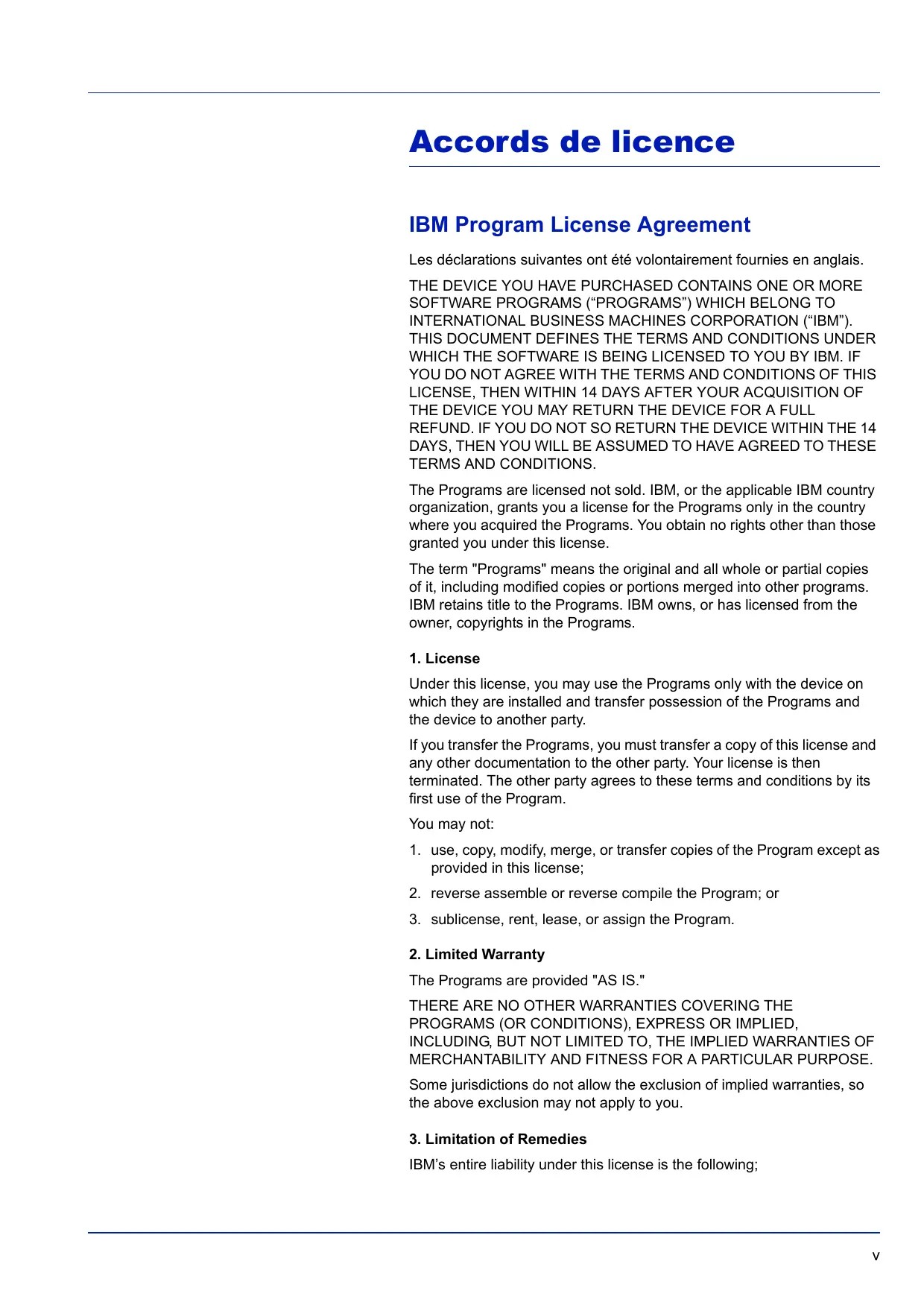 INTERNATIONAL BUSINESS MACHINES CORPORATION (“IBM”). THIS DOCUMENT DEFINES THE TERMS AND CONDITIONS UNDER WHICH THE SOFTWARE IS BEING LICENSED TO YOU BY IBM. IF YOU DO NOT AGREE WITH THE TERMS AND CONDITIONS OF THIS LICENSE, THEN WITHIN 14 DAYS AFTER YOUR ACQUISITION OF THE DEVICE YOU MAY RETURN THE DEVICE FOR A FULL REFUND. IF YOU DO NOT SO RETURN THE DEVICE WITHIN THE 14 DAYS, THEN YOU WILL BE ASSUMED TO HAVE AGREED TO THESE TERMS AND CONDITIONS. The Programs are licensed not sold. IBM, or the applicable IBM country organization, grants you a license for the Programs only in the country where you acquired the Programs. You obtain no rights other than those granted you under this license. The term "Programs" means the original and all whole or partial copies of it, including modified copies or portions merged into other programs. IBM retains title to the Programs. IBM owns, or has licensed from the owner, copyrights in the Programs.