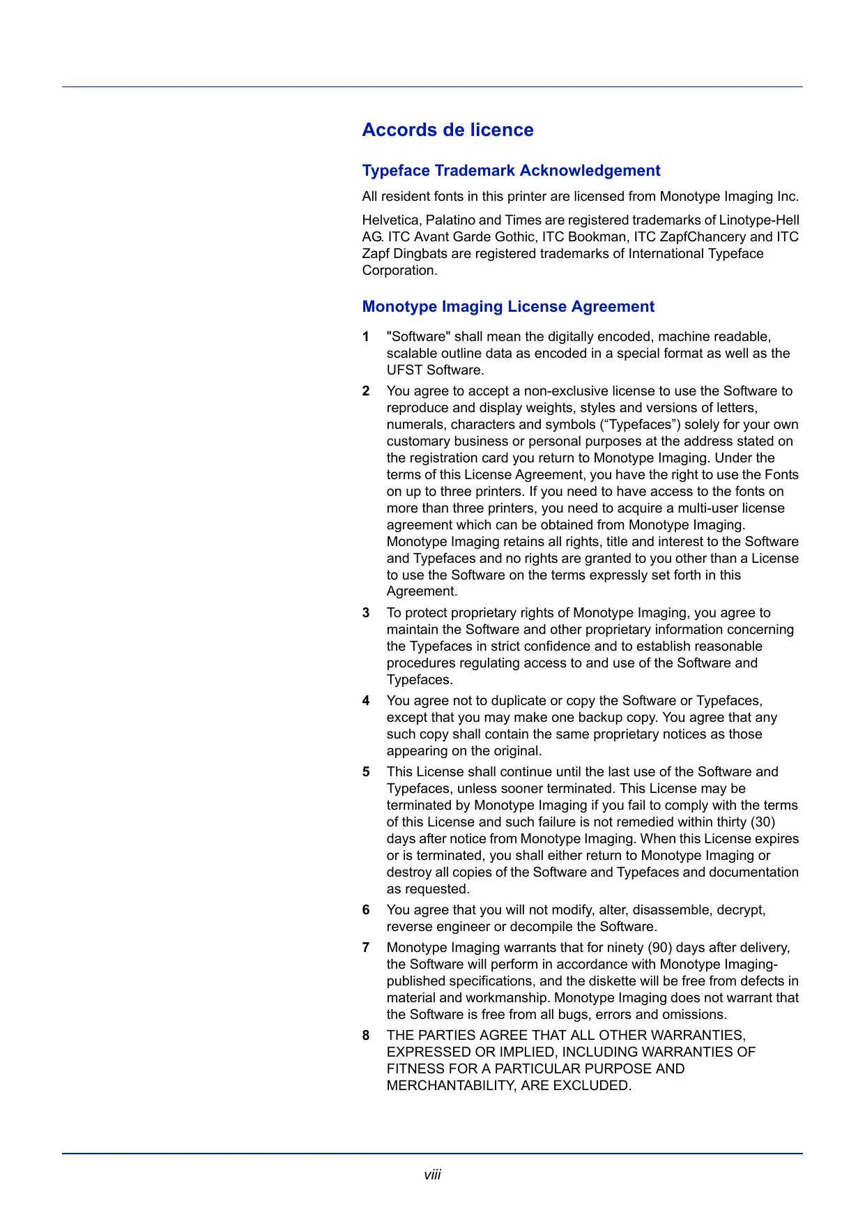 You agree to accept a non-exclusive license to use the Software to reproduce and display weights, styles and versions of letters, numerals, characters and symbols (“Typefaces”) solely for your own customary business or personal purposes at the address stated on the registration card you return to Monotype Imaging. Under the terms of this License Agreement, you have the right to use the Fonts on up to three printers. If you need to have access to the fonts on more than three printers, you need to acquire a multi-user license agreement which can be obtained from Monotype Imaging. Monotype Imaging retains all rights, title and interest to the Software and Typefaces and no rights are granted to you other than a License to use the Software on the terms expressly set forth in this Agreement.