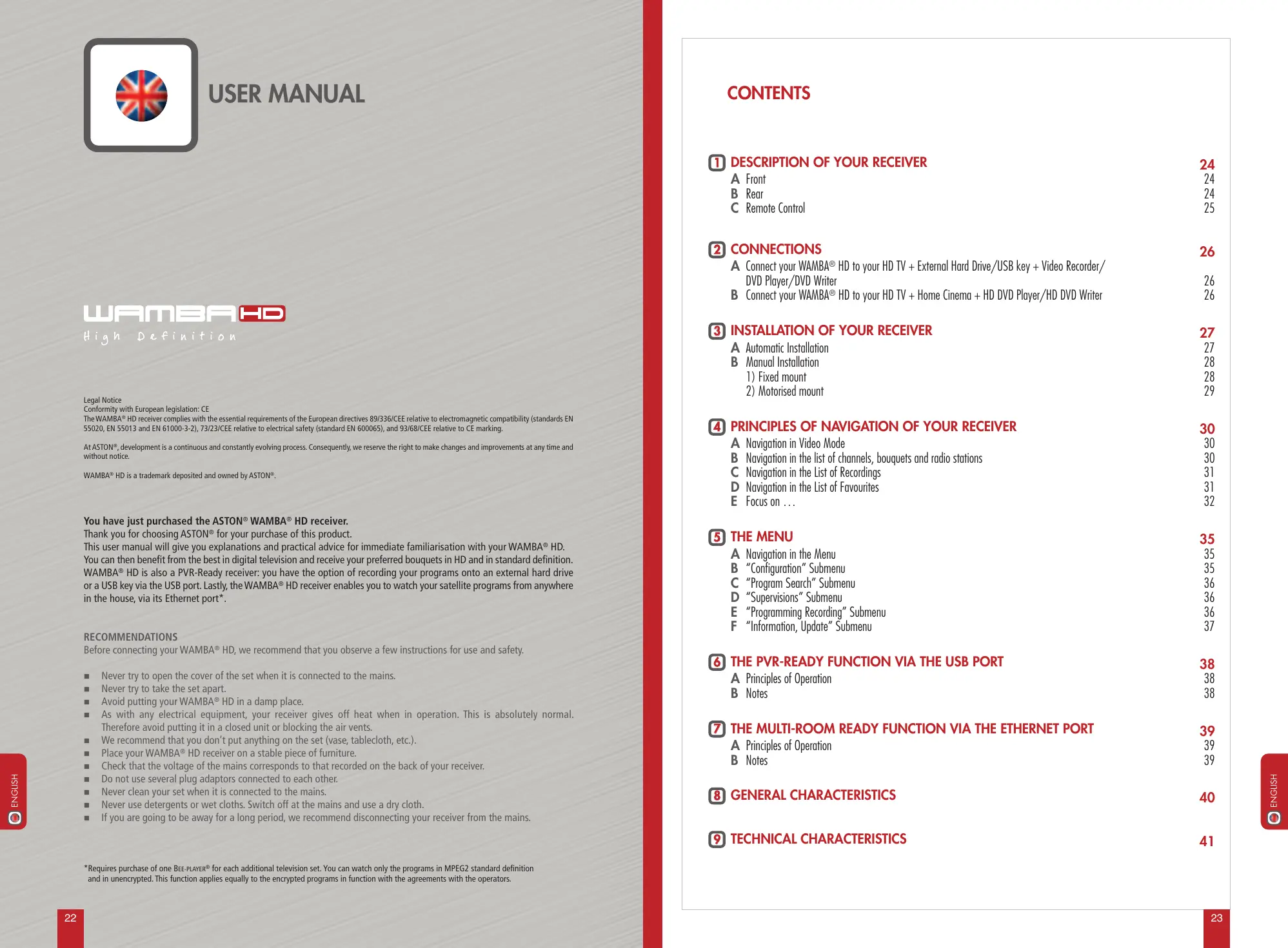 Legal Notice Conformity with European legislation: CE The WAMBA® HD receiver complies with the essential requirements of the European directives 89/336/CEE relative to electromagnetic compatibility (standards EN 55020, EN 55013 and EN 61000-3-2), 73/23/CEE relative to electrical safety (standard EN 600065), and 93/68/CEE relative to CE marking. At ASTON®, development is a continuous and constantly evolving process. Consequently, we reserve the right to make changes and improvements at any time and without notice. WAMBA® HD is a trademark deposited and owned by ASTON®. You have just purchased the ASTON® WAMBA® HD receiver. Thank you for choosing ASTON® for your purchase of this product. This user manual will give you explanations and practical advice for immediate familiarisation with your WAMBA® HD. You can then benefit from the best in digital television and receive your preferred bouquets in HD and in standard definition. WAMBA® HD is also a PVR-Ready receiver: you have the option of recording your programs onto an external hard drive or a USB key via the USB port. Lastly, the WAMBA® HD receiver enables you to watch your satellite programs from anywhere in the house, via its Ethernet port*. RECOMMENDATIONS Before connecting your WAMBA® HD, we recommend that you observe a few instructions for use and safety.