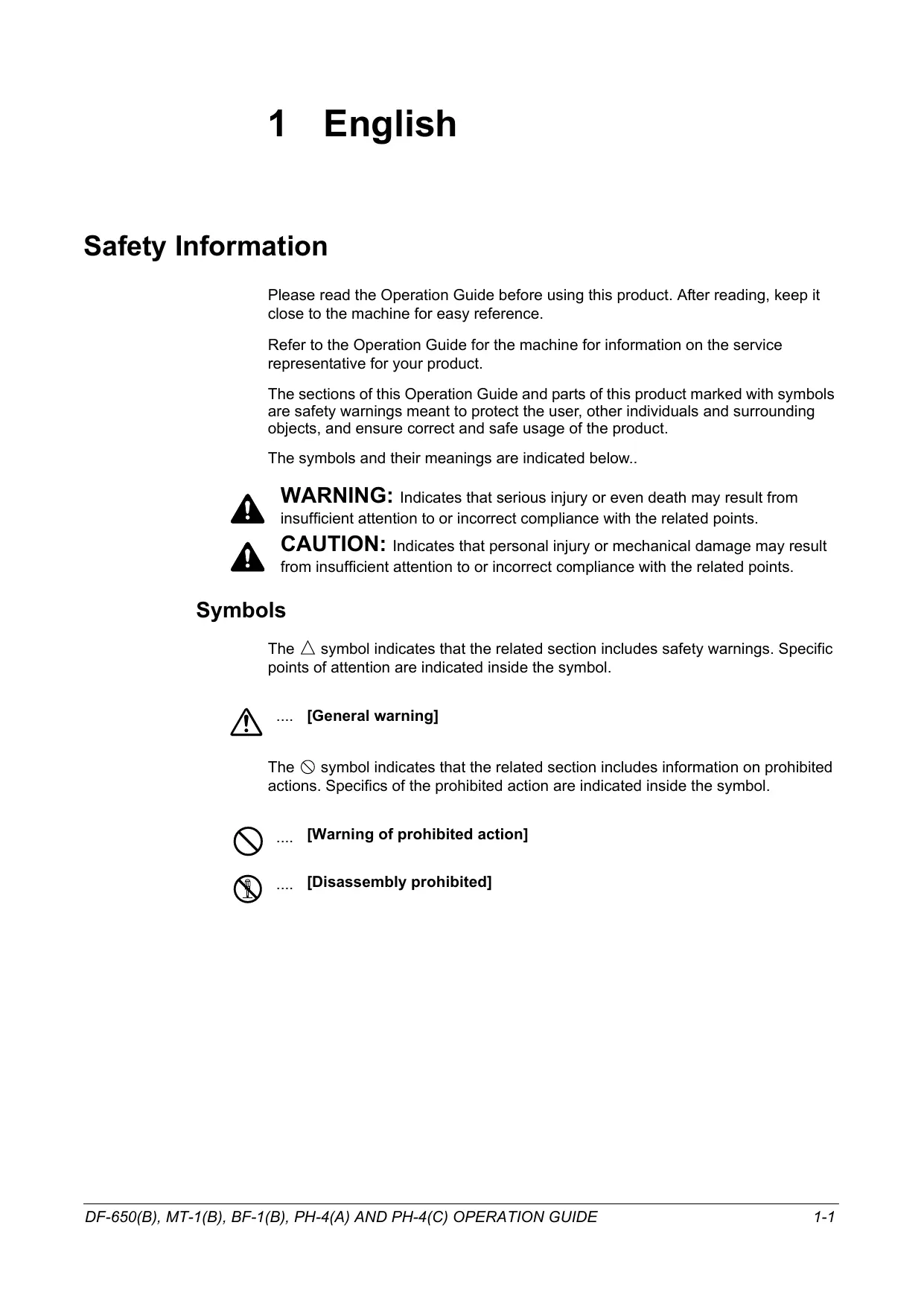 DF-650, MT-1(A), BF-1(A), PH-4A AND PH-4C OPERATION GUIDE 1 English Safety Information Please read the Operation Guide before using this product. After reading, keep it close to the machine for easy reference. Refer to the Operation Guide for the machine for information on the service representative for your product. The sections of this Operation Guide and parts of this product marked with symbols are safety warnings meant to protect the user, other individuals and surrounding objects, and ensure correct and safe usage of the product. The symbols and their meanings are indicated below..