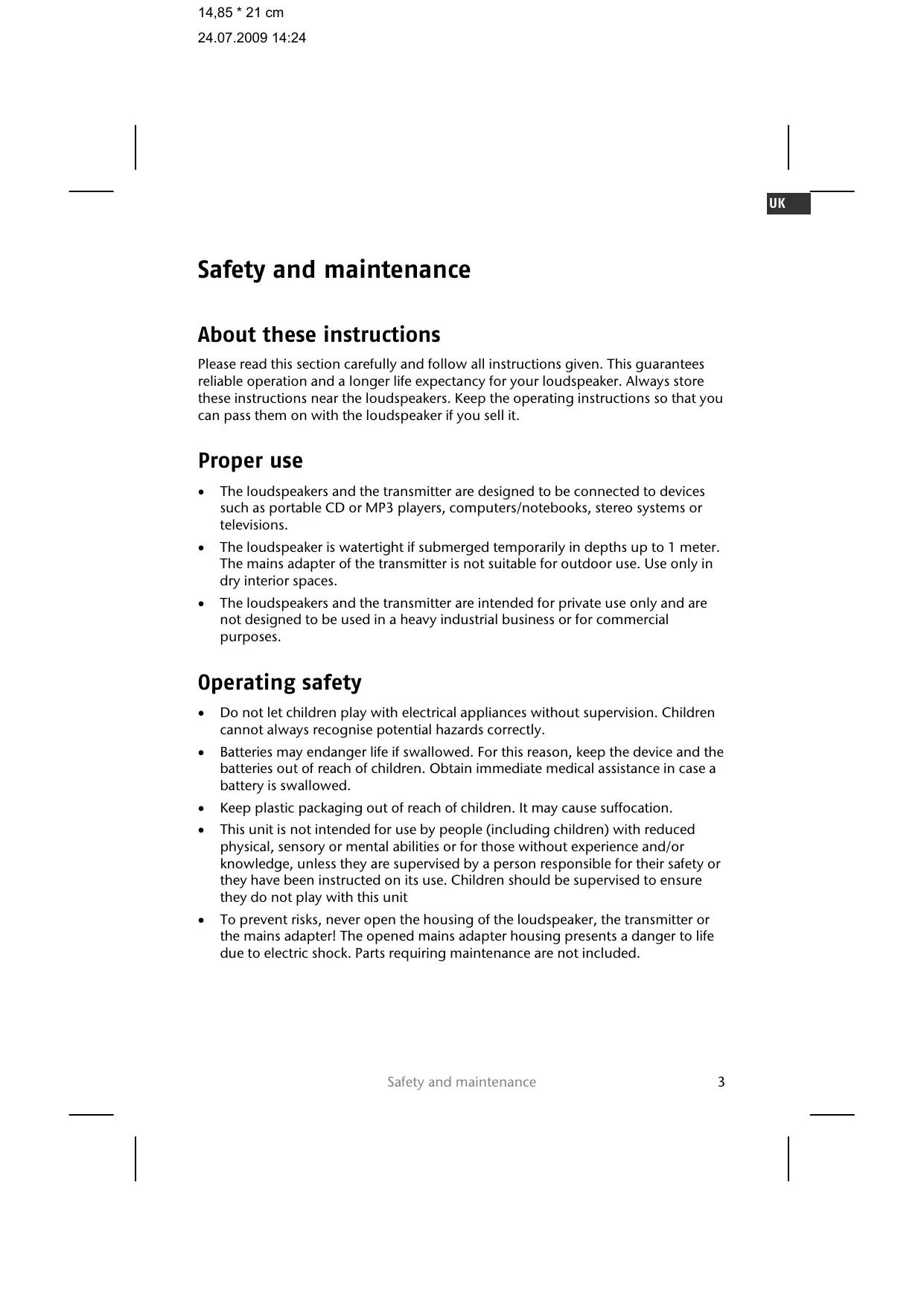 - The loudspeaker is watertight if submerged temporarily in depths up to 1 meter. The mains adapter of the transmitter is not suitable for outdoor use. Use only in dry interior spaces.