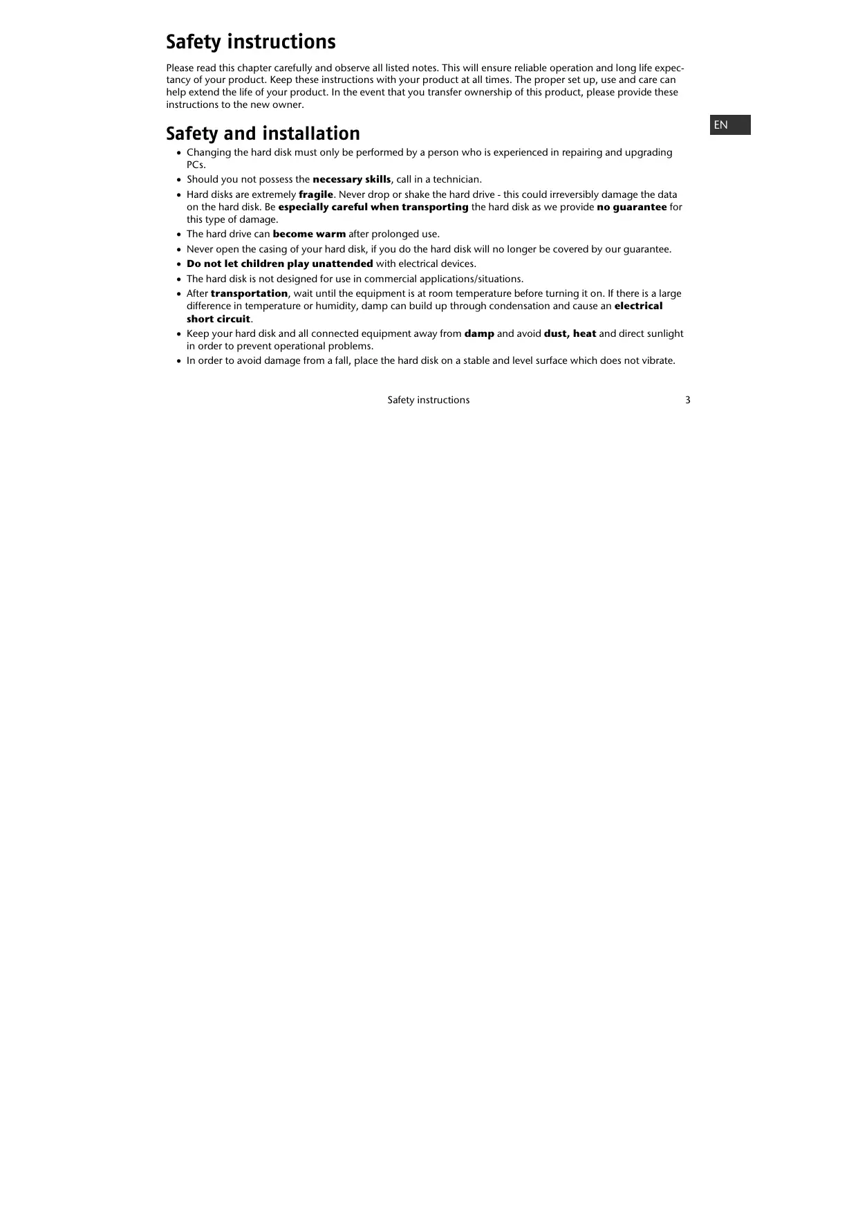 PCs. • Should you not possess the necessary skills, call in a technician. • Hard disks are extremely fragile. Never drop or shake the hard drive - this could irreversibly damage the data on the hard disk. Be especially careful when transporting the hard disk as we provide no guarantee for this type of damage. • The hard drive can become warm after prolonged use. • Never open the casing of your hard disk, if you do the hard disk will no longer be covered by our guarantee. • Do not let children play unattended with electrical devices. • The hard disk is not designed for use in commercial applications/situations. • After transportation, wait until the equipment is at room temperature before turning it on. If there is a large difference in temperature or humidity, damp can build up through condensation and cause an electrical short circuit. • Keep your hard disk and all connected equipment away from damp and avoid dust, heat and direct sunlight in order to prevent operational problems. • In order to avoid damage from a fall, place the hard disk on a stable and level surface which does not vibrate.
