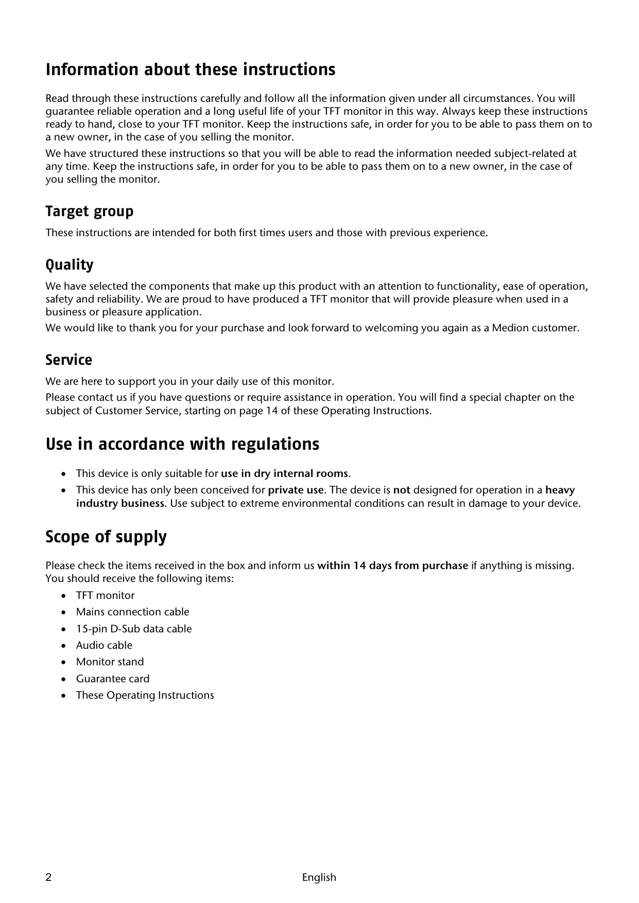 We have selected the components that make up this product with an attention to functionality, ease of operation, safety and reliability. We are proud to have produced a TFT monitor that will provide pleasure when used in a business or pleasure application. We would like to thank you for your purchase and look forward to welcoming you again as a Medion customer.