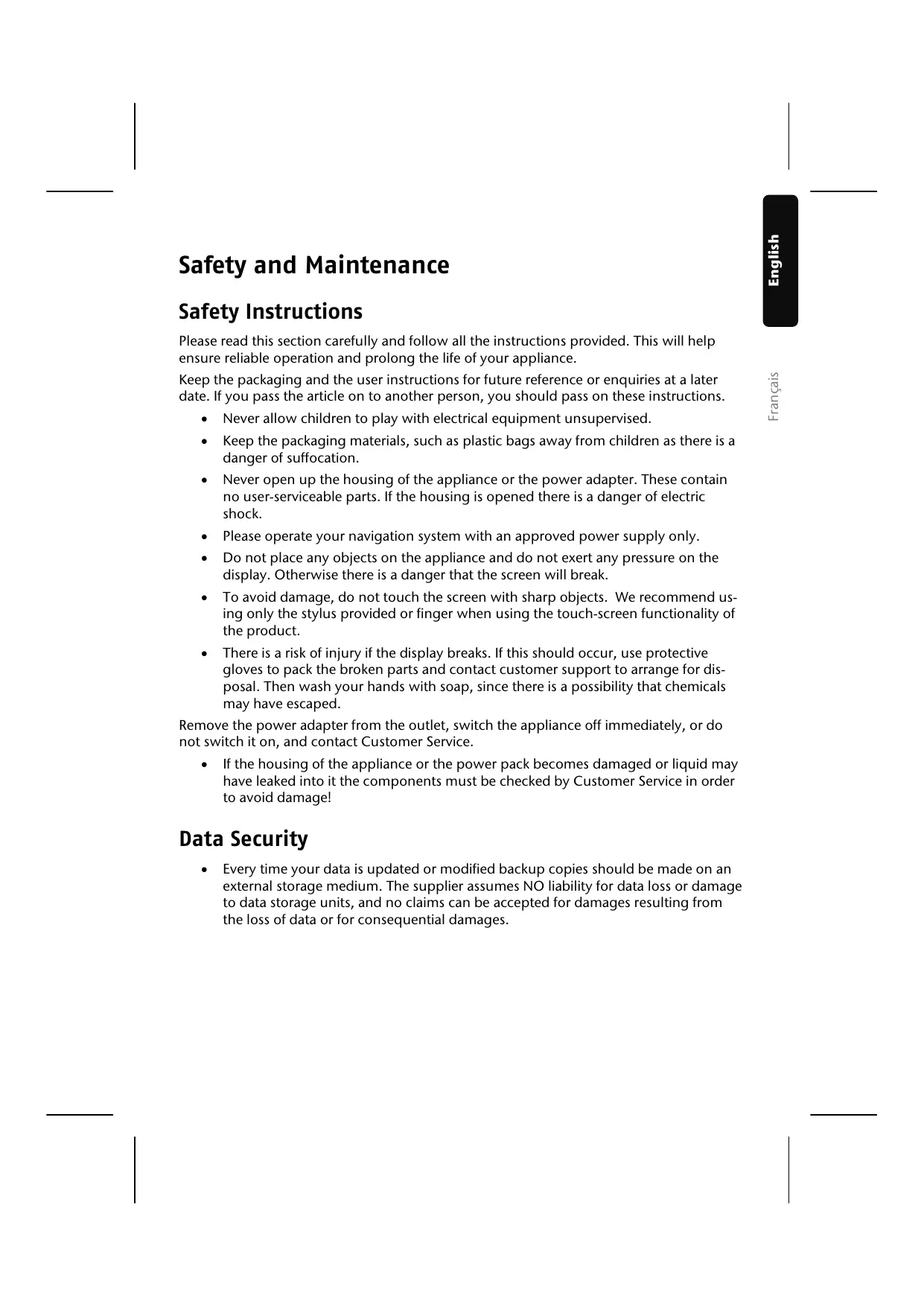 Effectuer des réglages ultérieurs 21 Demande du mot de passe22 Réinitialiser la navigation GPS 23 Soft Reset (redémarrage) 23 Arrêt complet/hard reset 24 Navigation 25 Consignes pour la navigation 25 Consignes de sécurité pour la navigation 25 Consignes de sécurité pour une utilisation dans un véhicule26 Orientation de l'antenne 27 I. Monter la fixation voiture 27 II. Fixer le système de navigation GPS 28 III. Brancher l'adaptateur voiture 29 IV. Démarrer le logiciel de navigation 30 Informations relatives à la surveillance du trafic 31 Lecteur MP3 (en option) 34 Présentation de l’écran principal 34 Sélection de titres et insertion dans la liste des favoris35 Liste des favoris 36 Liste des signets définis36 Picture Viewer (en option) 37 Utilisation de Picture Viewer 37 Présentation de l'écran principal 37 Affichage plein écran38 Réglage du volume 46 Fonction Snooze 47 Quitter Alarm Clock 47 Mode Mémoire de masse 57 Mode ActiveSync® 58 Possibilité alternative de chargement de l'accu 58 III. Travailler avec Microsoft® ActiveSync® 58 GPS (Global Positioning System) 59 Pour accéder à la carte mémoire 62 Échange de données via un lecteur de cartes 63 Autres cartes63 Transférer une carte sur une carte mémoire 63 Autre méthode d'installation du logiciel de navigation à partir d'une carte mémoire 64 Transfert de fichiers d'installation et de cartes dans la mémoire interne 64 Données techniques 65 Présentation du modèle 65 Conditions de garantie pour la France 66 Conditions de garantie pour la Belgie 72 Conditions de garantie pour le Luxembourg 77 Index 83
