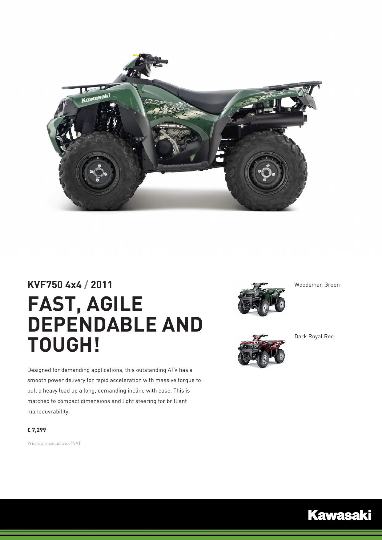 KVF750 4x4 / 2011 FAST, AGILE DEPENDABLE AND TOUGH! Designed for demanding applications, this outstanding ATV has a smooth power delivery for rapid acceleration with massive torque to pull a heavy Load up a Long, demanding incline with ease. This is matched to compact dimensions and light steering for brilliant manoeuvrability. £ 7,299 Woodsman Green Dark Royal Red