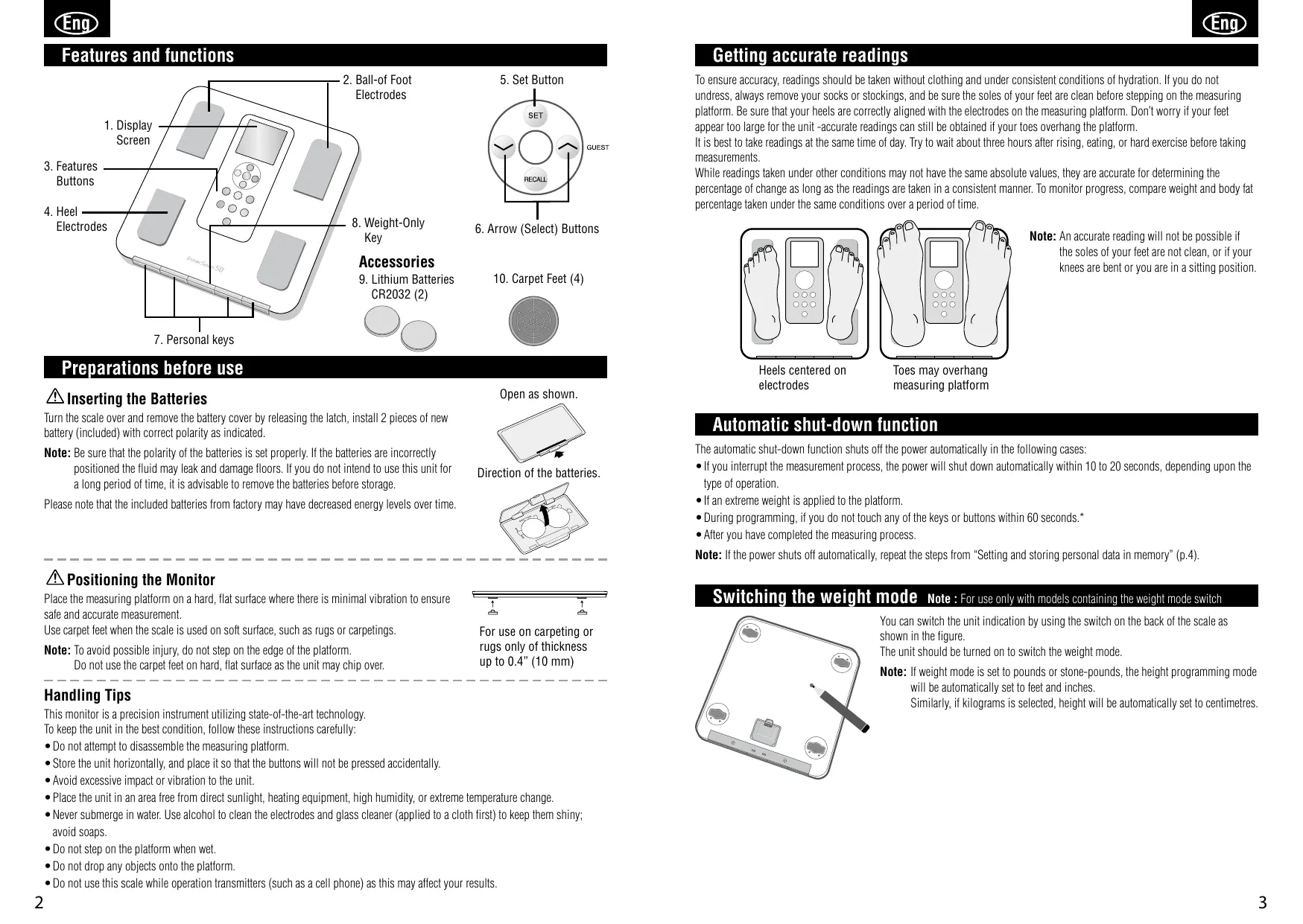CR2032 (2) To ensure accuracy, readings should be taken without clothing and under consistent conditions of hydration. If you do not undress, always remove your socks or stockings, and be sure the soles of your feet are clean before stepping on the measuring platform. Be sure that your heels are correctly aligned with the electrodes on the measuring platform. Don’t worry if your feet appear too large for the unit -accurate readings can still be obtained if your toes overhang the platform. It is best to take readings at the same time of day. Try to wait about three hours after rising, eating, or hard exercise before taking measurements. While readings taken under other conditions may not have the same absolute values, they are accurate for determining the percentage of change as long as the readings are taken in a consistent manner. To monitor progress, compare weight and body fat percentage taken under the same conditions over a period of time.