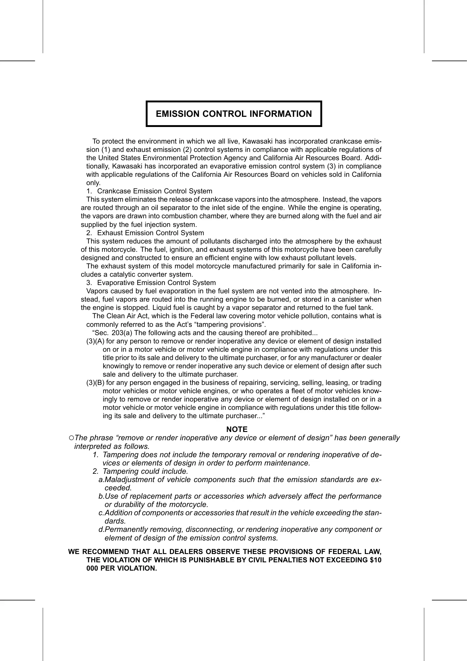 To protect the environment in which we all live, Kawasaki has incorporated crankcase emis- sion (1) and exhaust emission (2) control systems in compliance with applicable regulations of the United States Environmental Protection Agency and California Air Resources Board. Addi- tionally, Kawasaki has incorporated an evaporative emission control system (3) in compliance with applicable regulations of the California Air Resources Board on vehicles sold in California only.
