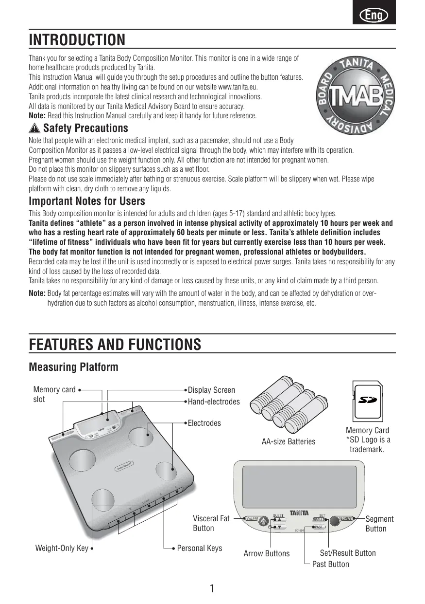 - Troubleshooting INTRODUCTION Thank you for selecting a Tanita Body Composition Monitor. This monitor is one in a wide range of home healthcare products produced by Tanita. This Instruction Manual will guide you through the setup procedures and outline the button features. Additional information on healthy living can be found on our website www.tanita.eu. Tanita products incorporate the latest clinical research and technological innovations. All data is monitored by our Tanita Medical Advisory Board to ensure accuracy. Note: Read this Instruction Manual carefully and keep it handy for future reference. Safety Precautions Note that people with an electronic medical implant, such as a pacemaker, should not use a Body Composition Monitor as it passes a low-level electrical signal through the body, which may interfere with its operation. Pregnant women should use the weight function only. All other function are not intended for pregnant women. Do not place this monitor on slippery surfaces such as a wet floor. Please do not use scale immediately after bathing or strenuous exercise. Scale platform will be slippery when wet. Please wipe platform with clean, dry cloth to remove any liquids. Important Notes for Users This Body composition monitor is intended for adults and children (ages 5-17) standard and athletic body types. Tanita defines “athlete” as a person involved in intense physical activity of approximately 10 hours per week and who has a resting heart rate of approximately 60 beats per minute or less. Tanita’s athlete definition includes “lifetime of fitness” individuals who have been fit for years but currently exercise less than 10 hours per week. The body fat monitor function is not intended for pregnant women, professional athletes or bodybuilders. Recorded data may be lost if the unit is used incorrectly or is exposed to electrical power surges. Tanita takes no responsibility for any kind of loss caused by the loss of recorded data. Tanita takes no responsibility for any kind of damage or loss caused by these units, or any kind of claim made by a third person. Note: Body fat percentage estimates will vary with the amount of water in the body, and can be affected by dehydration or overhydration due to such factors as alcohol consumption, menstruation, illness, intense exercise, etc. p. 11