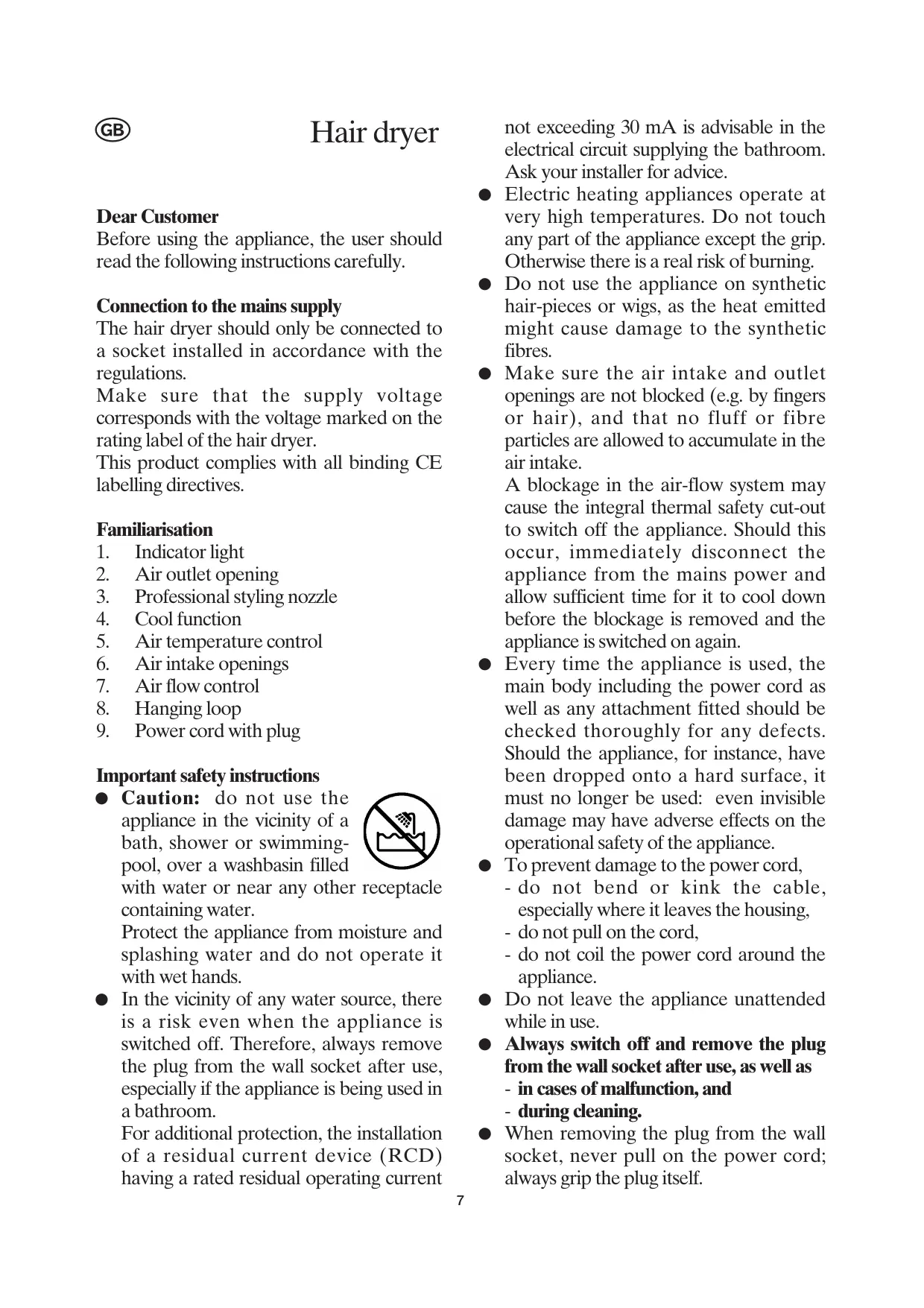 not exceeding 30 mA is advisable in the electrical circuit supplying the bathroom. Ask your installer for advice. Electric heating appliances operate at very high temperatures. Do not touch any part of the appliance except the grip. Otherwise there is a real risk of burning. Do not use the appliance on synthetic hair-pieces or wigs, as the heat emitted might cause damage to the synthetic fibres. Make sure the air intake and outlet openings are not blocked (e.g. by fingers or hair), and that no fluff or fibre particles are allowed to accumulate in the air intake. A blockage in the air-flow system may cause the integral thermal safety cut-out to switch off the appliance. Should this occur, immediately disconnect the appliance from the mains power and allow sufficient time for it to cool down before the blockage is removed and the appliance is switched on again. Every time the appliance is used, the main body including the power cord as well as any attachment fitted should be checked thoroughly for any defects. Should the appliance, for instance, have been dropped onto a hard surface, it must no longer be used: even invisible damage may have adverse effects on the operational safety of the appliance. To prevent damage to the power cord, - do not bend or kink the cable, especially where it leaves the housing, - do not pull on the cord, - do not coil the power cord around the appliance. Do not leave the appliance unattended while in use. Always switch off and remove the plug from the wall socket after use, as well as - in cases of malfunction, and - during cleaning. When removing the plug from the wall socket, never pull on the power cord; always grip the plug itself.