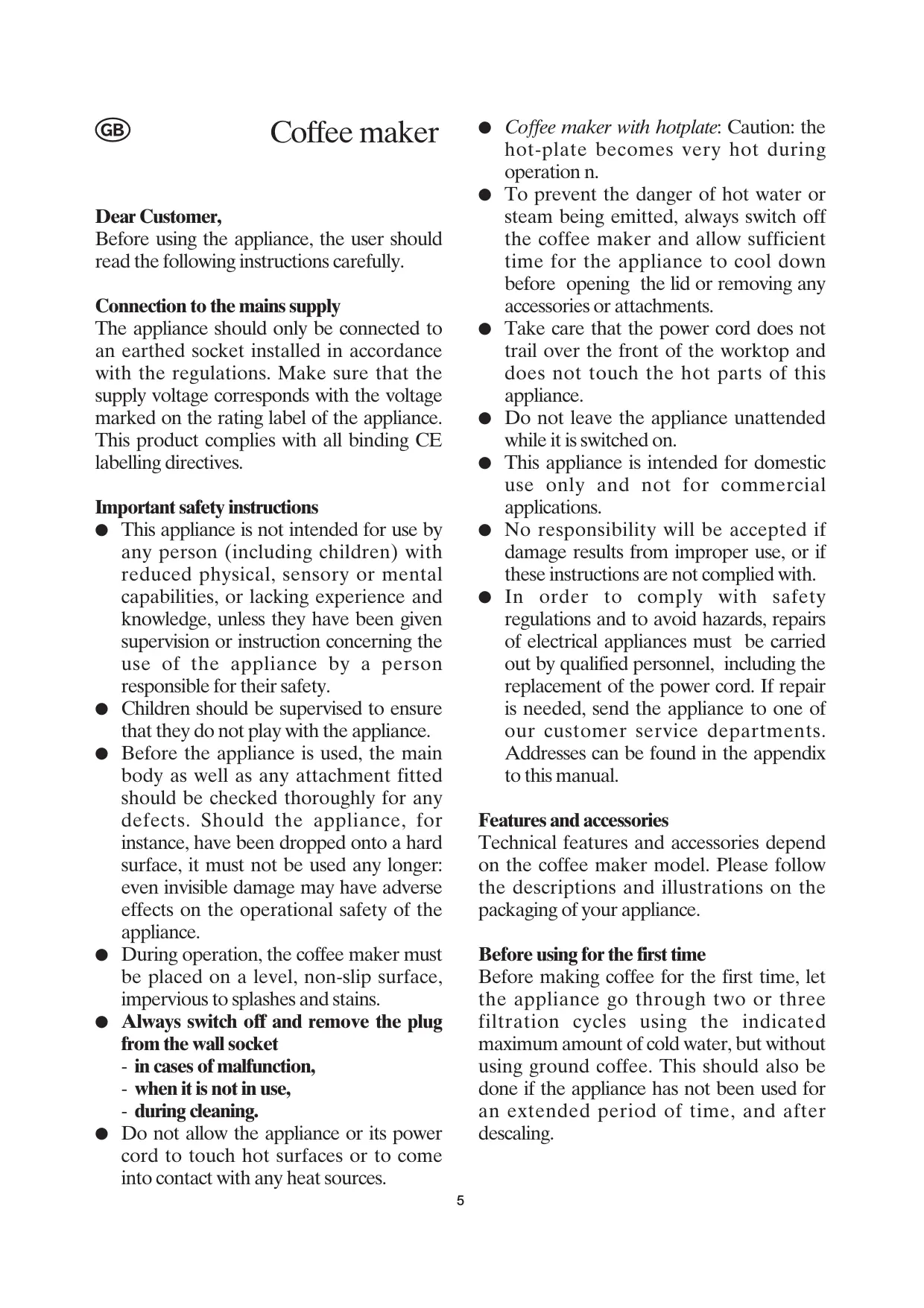 e During operation, the coffee maker must be placed on a level, non-slip surface, impervious to splashes and stains.