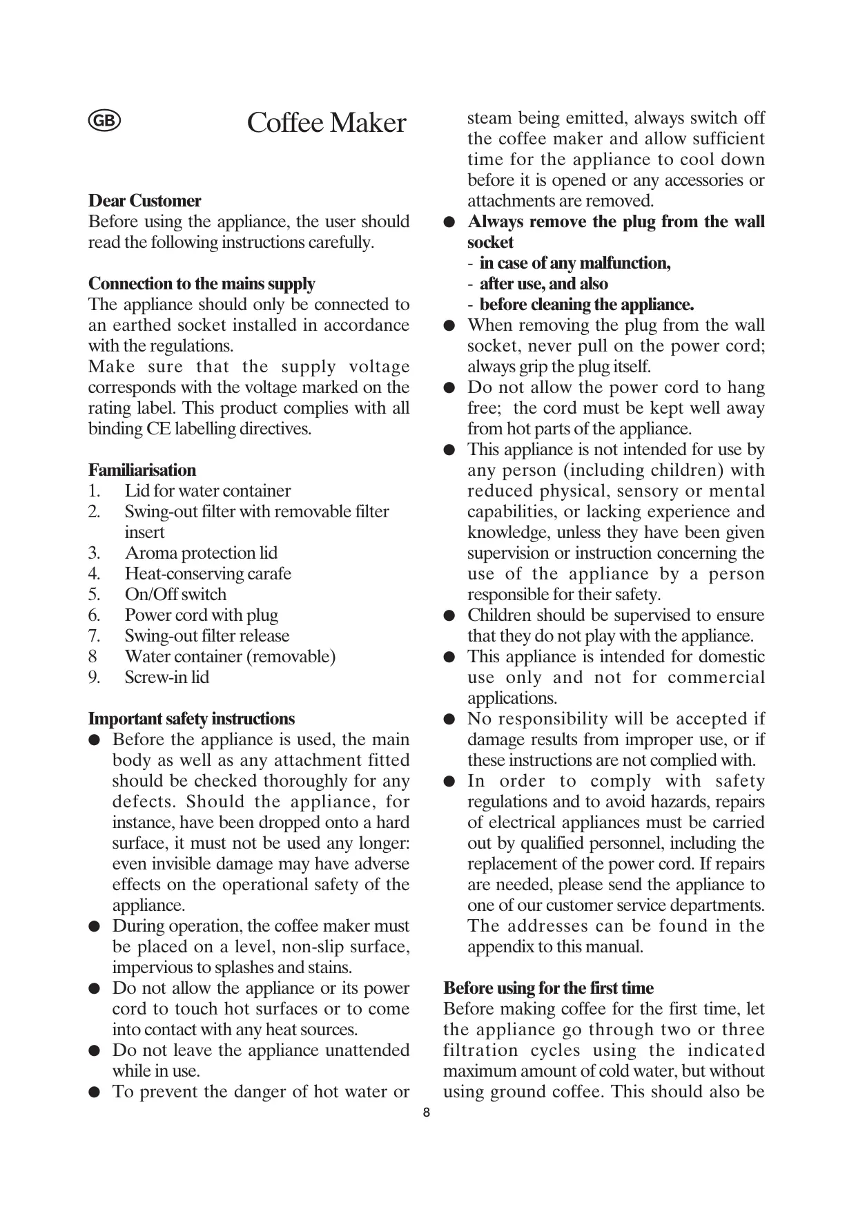 Coffee Maker Dear Customer Before using the appliance, the user should read the following instructions carefully. Connection to the mains supply The appliance should only be connected to an earthed socket installed in accordance with the regulations. Make sure that the supply voltage corresponds with the voltage marked on the rating label. This product complies with all binding CE labelling directives. Familiarisation