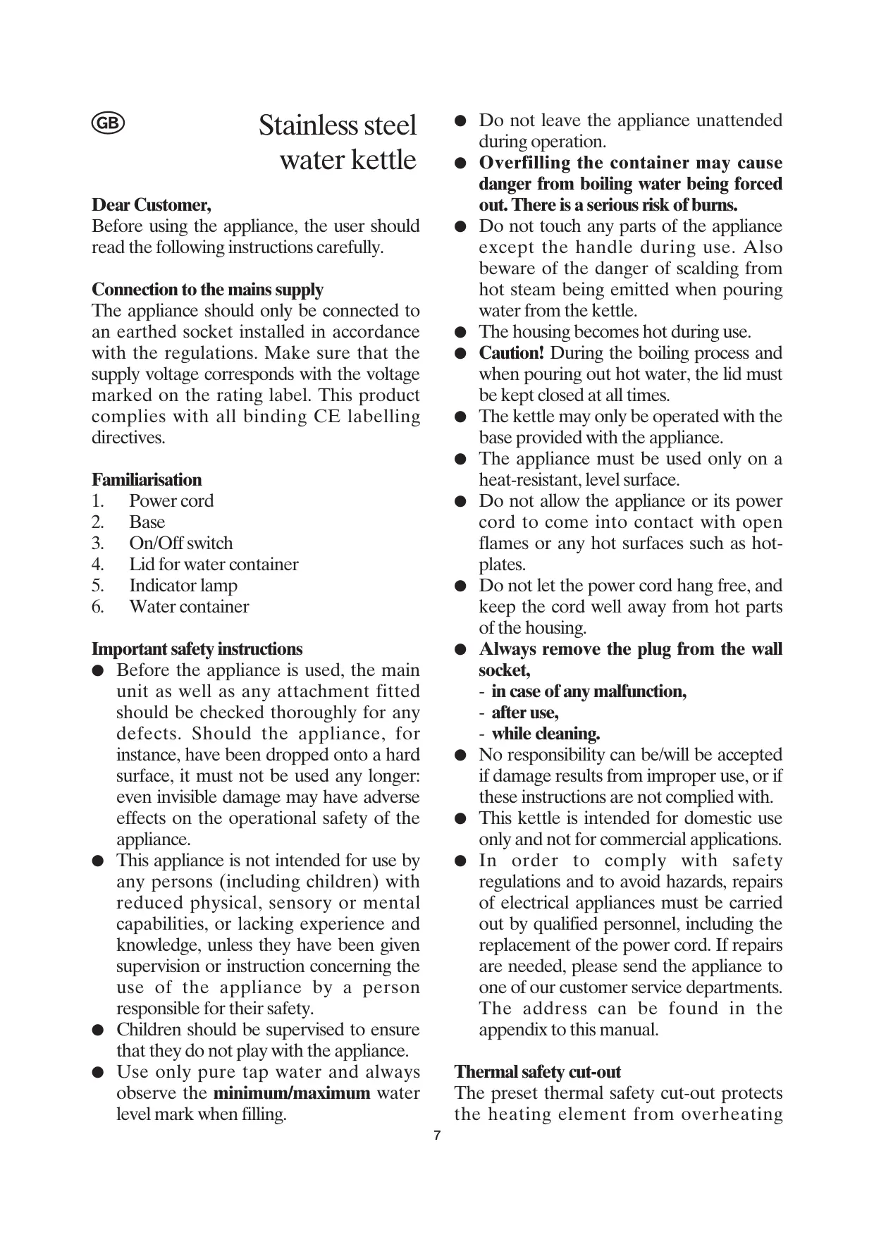 should the appliance be erroneously switched on without any water, or if the water container is calcified. Once the safety cut-out has switched off the kettle, it must be allowed to cool down sufficiently, or must be descaled before it is switched on again. Before using for the first time
