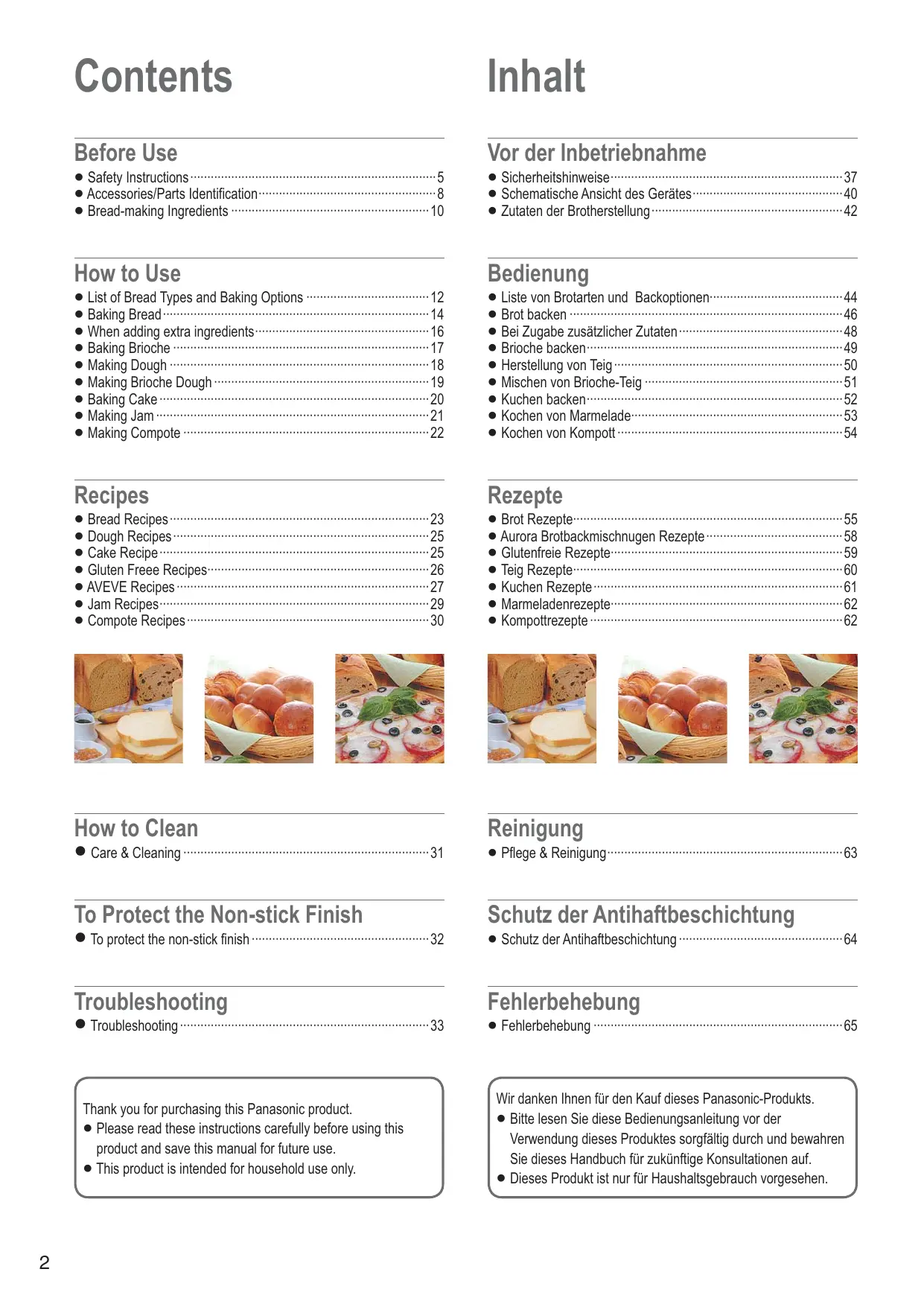 Automatic Bread Maker OPERATING INSTRUCTIONS AND RECIPES (Household Use) English Safety Instructions ········································································5 Accessories/Parts Identification ····················································8 Bread-making Ingredients ··························································10 List of Bread Types and Baking Options ····································12 Baking Bread ··············································································14 When adding extra ingredients ···················································16 Baking Brioche ···········································································17 Making Dough ············································································18 Making Brioche Dough ·······························································19 Baking Cake ···············································································20 Making Jam ················································································21 Making Compote ········································································22 Bread Recipes ············································································23 Dough Recipes ···········································································25 Cake Recipe ···············································································25 Gluten Freee Recipes·································································26 AVEVE Recipes ··········································································27 Jam Recipes ···············································································29 Compote Recipes ·······································································30 Care & Cleaning ········································································31 To Protect the Non-stick Finish To protect the non-stick finish ····················································32 Troubleshooting Troubleshooting ·········································································33 Thank you for purchasing this Panasonic product. Please read these instructions carefully before using this product and save this manual for future use. This product is intended for household use only.