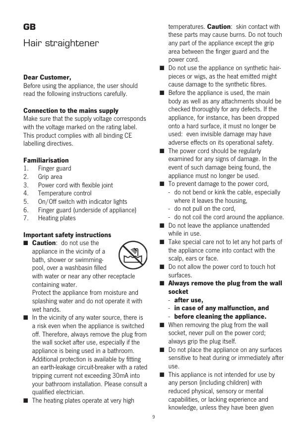- Do not use the appliance on synthetic hairpieces or wigs, as the heat emitted might cause damage to the synthetic fibres.