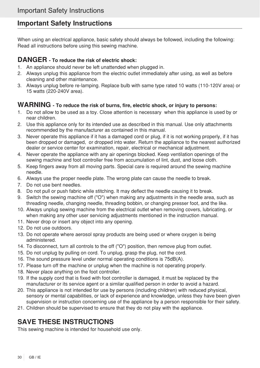 SAVE THESE INSTRUCTIONS This sewing machine is intended for household use only.