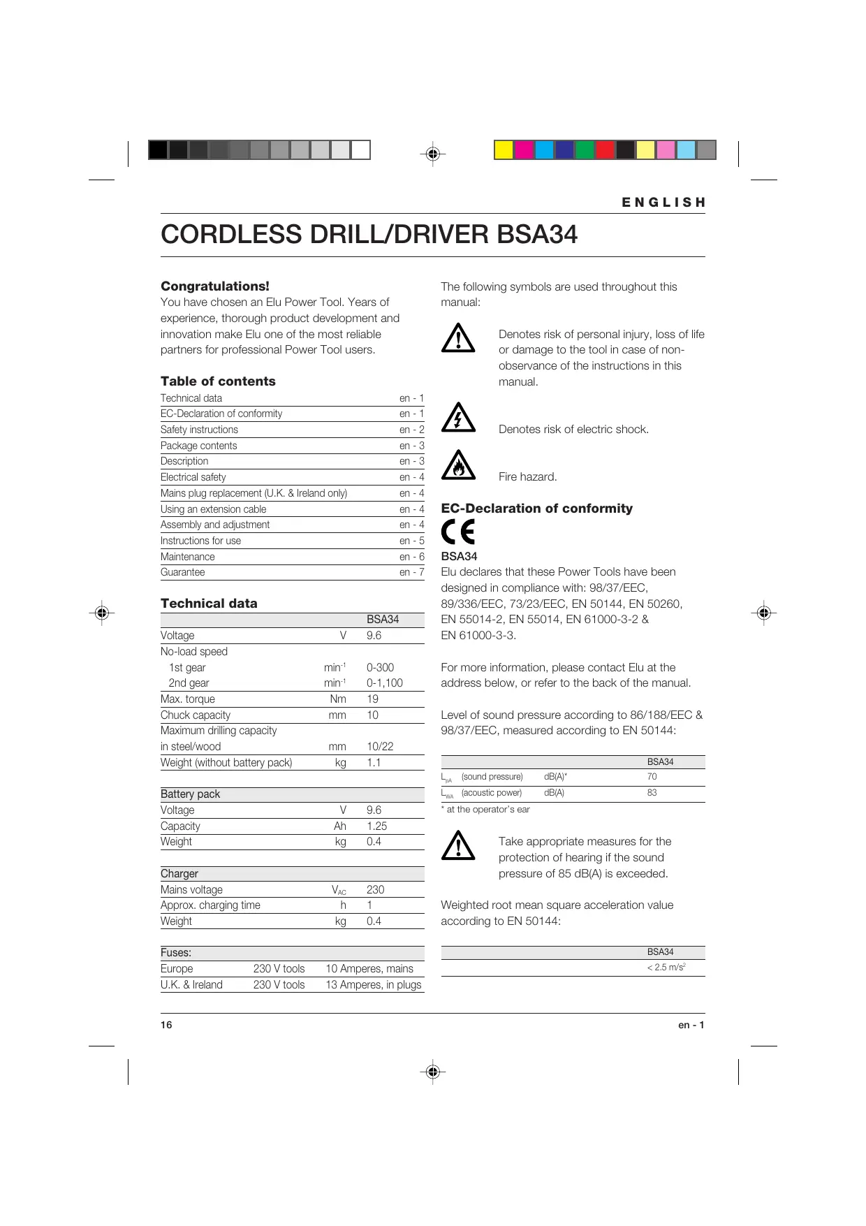 Your cordless drill/driver BSA34 has been designed for professional drilling and screwdriving applications.