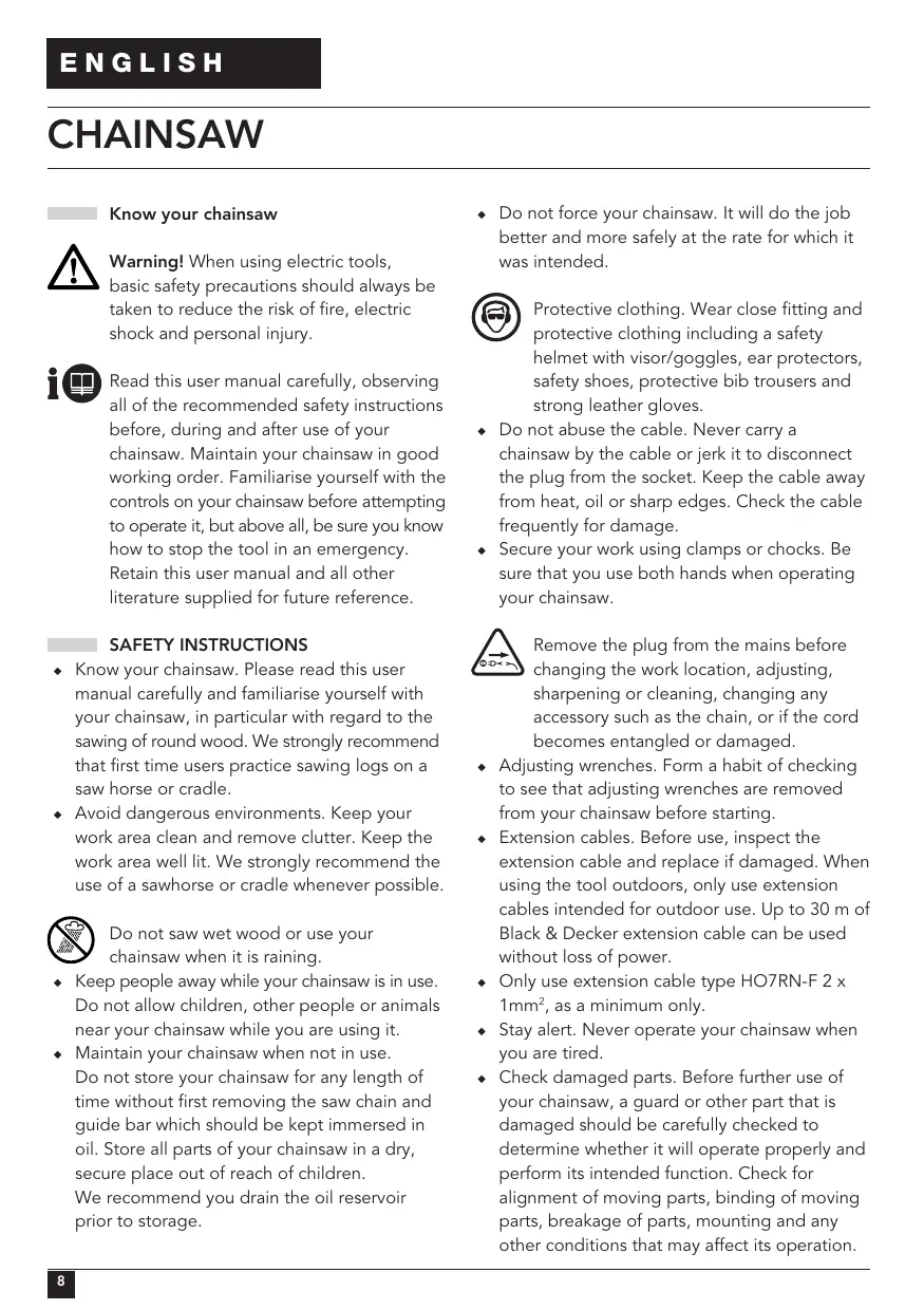 Do not force your chainsaw. It will do the job better and more safely at the rate for which it was intended. Protective clothing. Wear close fitting and protective clothing including a safety helmet with visor/goggles, ear protectors, safety shoes, protective bib trousers and strong leather gloves. Do not abuse the cable. Never carry a chainsaw by the cable or jerk it to disconnect the plug from the socket. Keep the cable away from heat, oil or sharp edges. Check the cable frequently for damage. Secure your work using clamps or chocks. Be sure that you use both hands when operating your chainsaw. Remove the plug from the mains before changing the work location, adjusting, sharpening or cleaning, changing any accessory such as the chain, or if the cord becomes entangled or damaged. Adjusting wrenches. Form a habit of checking to see that adjusting wrenches are removed from your chainsaw before starting. Extension cables. Before use, inspect the extension cable and replace if damaged. When using the tool outdoors, only use extension cables intended for outdoor use. Up to 30 m of Black & Decker extension cable can be used without loss of power. Only use extension cable type HO7RN-F 2 x 1mm2, as a minimum only. Stay alert. Never operate your chainsaw when you are tired. Check damaged parts. Before further use of your chainsaw, a guard or other part that is damaged should be carefully checked to determine whether it will operate properly and perform its intended function. Check for alignment of moving parts, binding of moving parts, breakage of parts, mounting and any other conditions that may affect its operation. ENGLISH