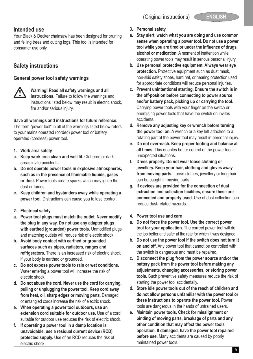 (Original instructions) Intended use Your Black & Decker chainsaw has been designed for pruning and felling trees and cutting logs. This tool is intended for consumer use only. Safety instructions General power tool safety warnings