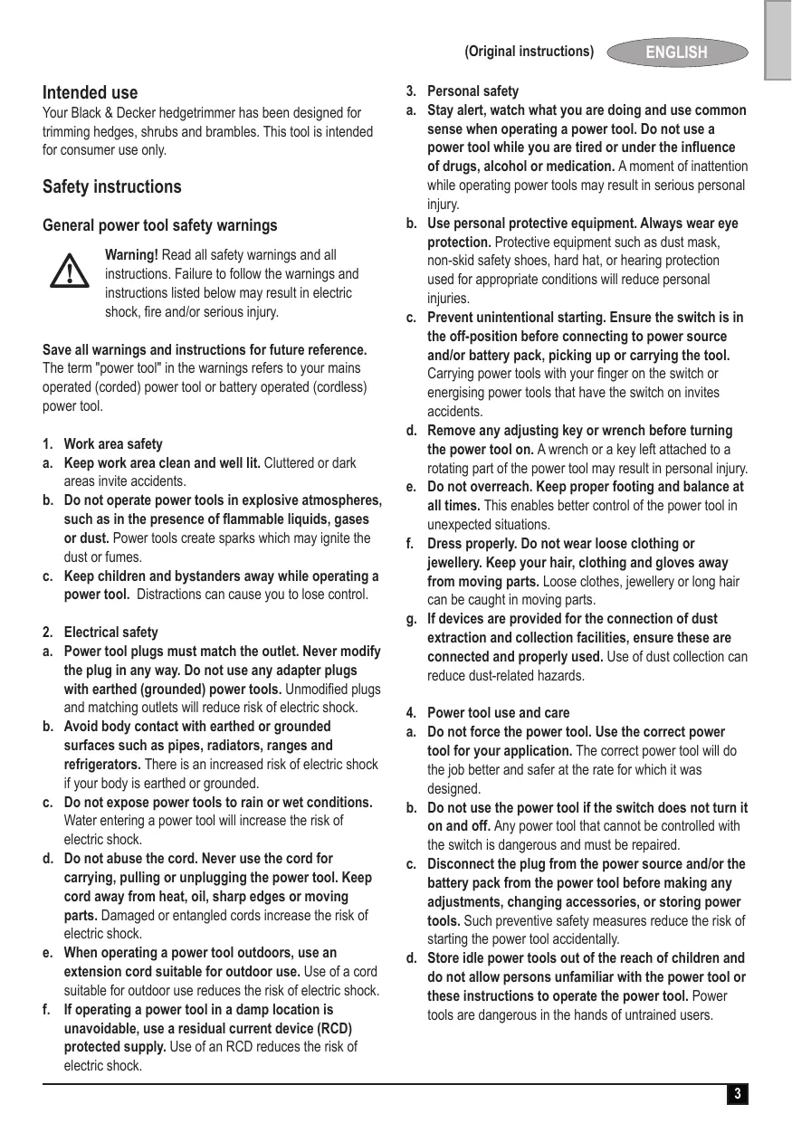 En este manual de instrucciones se describe el uso para el que se ha diseñado el aparato. La utilización de accesorios o la realización de operaciones con esta herramienta distintas de las recomendadas en este manual de instrucciones puede implicar un riesgo de lesiones y/o daños materiales. Si no ha utilizado nunca un cortasetos, se recomienda solicitar instrucciones prácticas a un usuario experimentado además de leer detenidamente este manual. Nunca toque las hojas mientras la herramienta esté en funcionamiento. Nunca intente forzar las hojas para que se detengan. No suelte la herramienta hasta que las hojas se hayan detenido por completo. Compruebe con regularidad que las hojas no estén dañadas o gastadas. No utilice la herramienta si las hojas están dañadas. Procure evitar los objetos duros (por ejemplo, alambres o verjas) durante las operaciones de corte. Si golpea algún objeto de estas características de forma accidental, apague de inmediato la herramienta y compruebe si ha ocasionado algún daño.