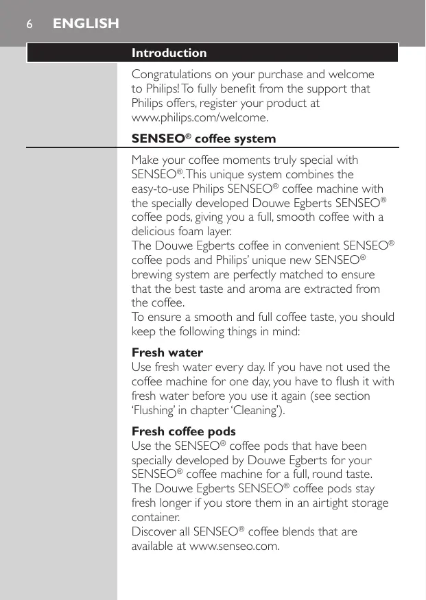 English Introduction Congratulations on your purchase and welcome to Philips! To fully benefit from the support that Philips offers, register your product at www.philips.com/welcome. SENSEO® coffee system Make your coffee moments truly special with SENSEO®. This unique system combines the easy-to-use Philips SENSEO® coffee machine with the specially developed Douwe Egberts SENSEO® coffee pods, giving you a full, smooth coffee with a delicious foam layer. The Douwe Egberts coffee in convenient SENSEO® coffee pods and Philips’ unique new SENSEO® brewing system are perfectly matched to ensure that the best taste and aroma are extracted from the coffee. To ensure a smooth and full coffee taste, you should keep the following things in mind: Fresh water Use fresh water every day. If you have not used the coffee machine for one day, you have to flush it with fresh water before you use it again (see section ‘Flushing’ in chapter ‘Cleaning’). Fresh coffee pods Use the SENSEO® coffee pods that have been specially developed by Douwe Egberts for your SENSEO® coffee machine for a full, round taste. The Douwe Egberts SENSEO® coffee pods stay fresh longer if you store them in an airtight storage container. Discover all SENSEO® coffee blends that are available at www.senseo.com. English