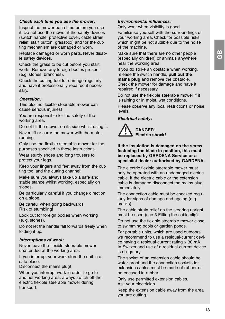 Check each time you use the mower: Inspect the mower each time before you use it. Do not use the mower if the safety devices (switch handle, protective cover, cable strain relief, start button, grassbox) and/or the cut- ting mechanism are damaged or wo. Replace damaged or worn parts. Never disab- le safety devices. Check the grass to be cut before you start work. Remove any foreign bodies present (e-g. stones, branches). Check the cutting tool for damage regularly and have it professionally repaired if neces- sary. Operation: This electric flexible steerable mower can cause serious injuries! You are responsible for the safety of the working area. Do not tilt the mower on its side whilst using it. Never lift or carry the mower with the motor running. Only use the flexible steerable mower for the purposes specified in these instructions. Wear sturdy shoes and long trousers to protect your legs. Keep your fingers and feet away from the cut- ting tool and the cutting channel! Make sure you always take up a safe and stable stance whilst working, especially on slopes. Be particularly careful if you change direction on a slope. Be careful when going backwards. Risk of stumbling! Look out for foreign bodies when working (e. g. stones). Do not let the handle fall forwards freely when folding it up. Interruptions of work: Never leave the flexible steerable mower unattended at the working area. If you interrupt your work store the unit in a safe place. Disconnect the mains plug! When you interrupt work in order to go to another working area, always switch off the electric flexible steerable mower during transport. Environmental influences : Only work when visibility is good. Familiarise yourself with the surroundings of your working area. Check for possible risks which might be not audible due to the noise of the machine. Make sure that there are no other people {especially children) or animals anywhere near the working area. If you do strike an obstacle when working, release the switch handle, pull out the mains plug and remove the obstacle. Check the mower for damage and have it repaired if necessary. Do not use the flexible steerable mower if it is raining or in moist, wet conditions. Please observe any local restrictions or noise levels. Electrical safety: A DANGER! Electric shock! If the insulation is damaged on the screw fastening the blade in position, this must be replaced by GARDENA Service or a specialist dealer authorised by GARDENA. The electric flexible steerable mower must only be operated with an undamaged electric cable. If the electric cable or the extension cable is damaged disconnect the mains plug immediately. The connection cable must be checked regu- larly for signs of damage and ageing (e.g. cracks). The cable strain relief on the steering upright must be used (see 3 Fitting the cable clip). Do not use the flexible steerable mower close to swimming pools or garden ponds. For portable units, which are used outdoors, we recommend to use a residual-current devi- ce having a residual-current rating < 80 mA. In Switzerland use of a residual-current device is obligatory. The socket of an extension cable should be water-proof and the connection sockets for extension cables must be made of rubber or be encased in rubber. Only use permitted extension cables. Ask your electrician. Keep the extension cable away from the area you are cutting.